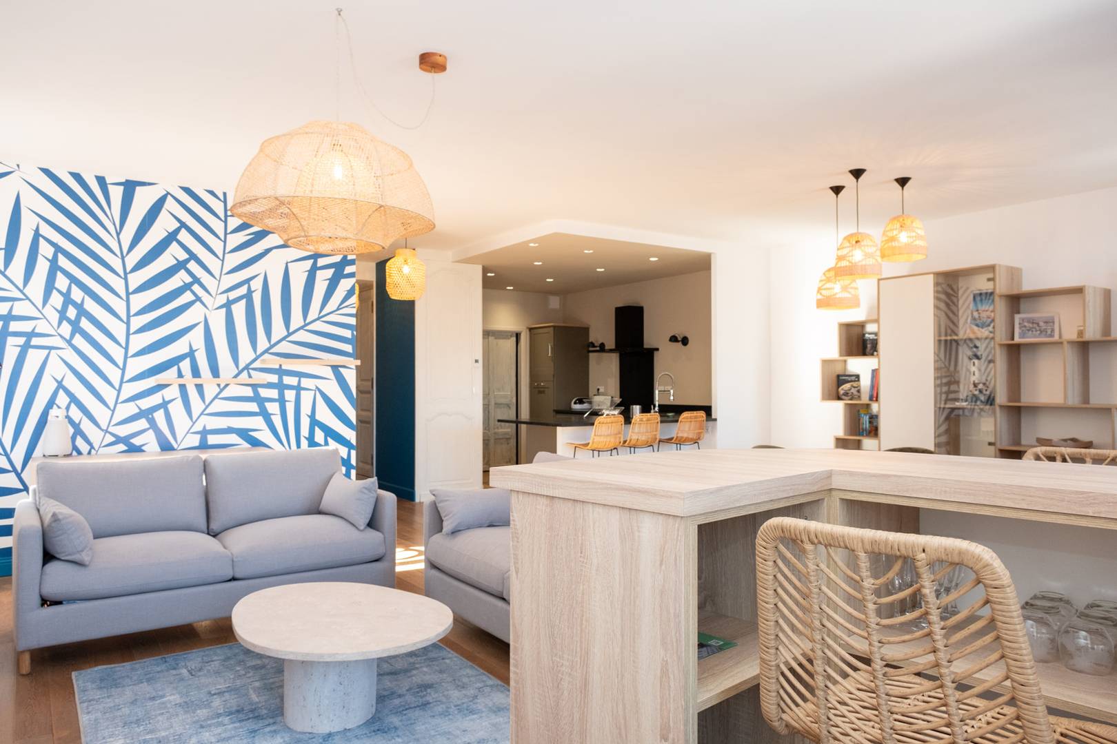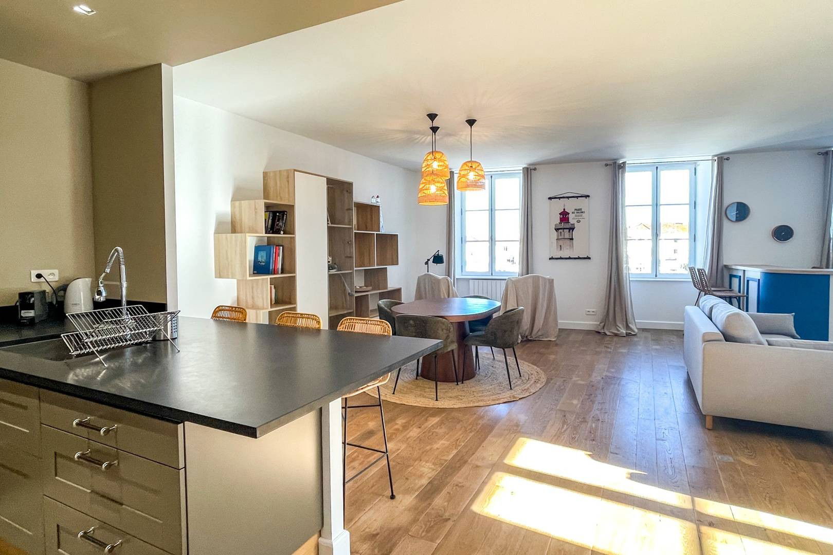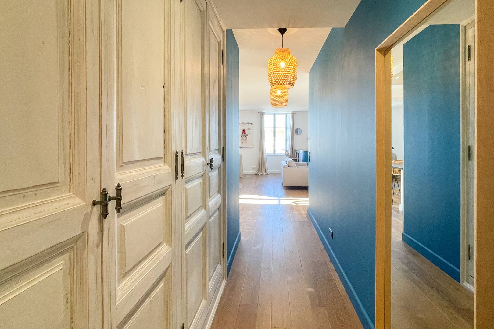 The Port apartment is a large 117m2 apartment renovated in 2024 by a decorator on the floor of a historic building. It has two double bedrooms with two bathrooms and 3 toilets. Overlooking the lively port of Saint Martin de Ré, the historic capital, you will have a front row seat to the activity of the Island while enjoying the beauty of the tides and sunsets over the Port. With its fully equipped American kitchen, you can create your own “home” during your "Retais" stay.