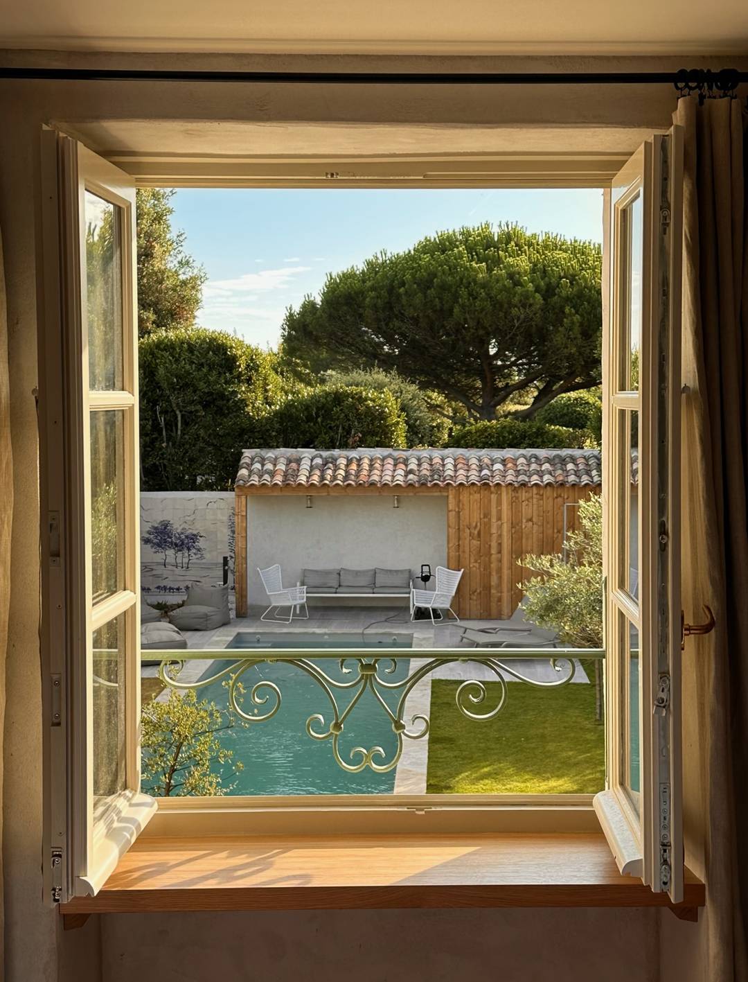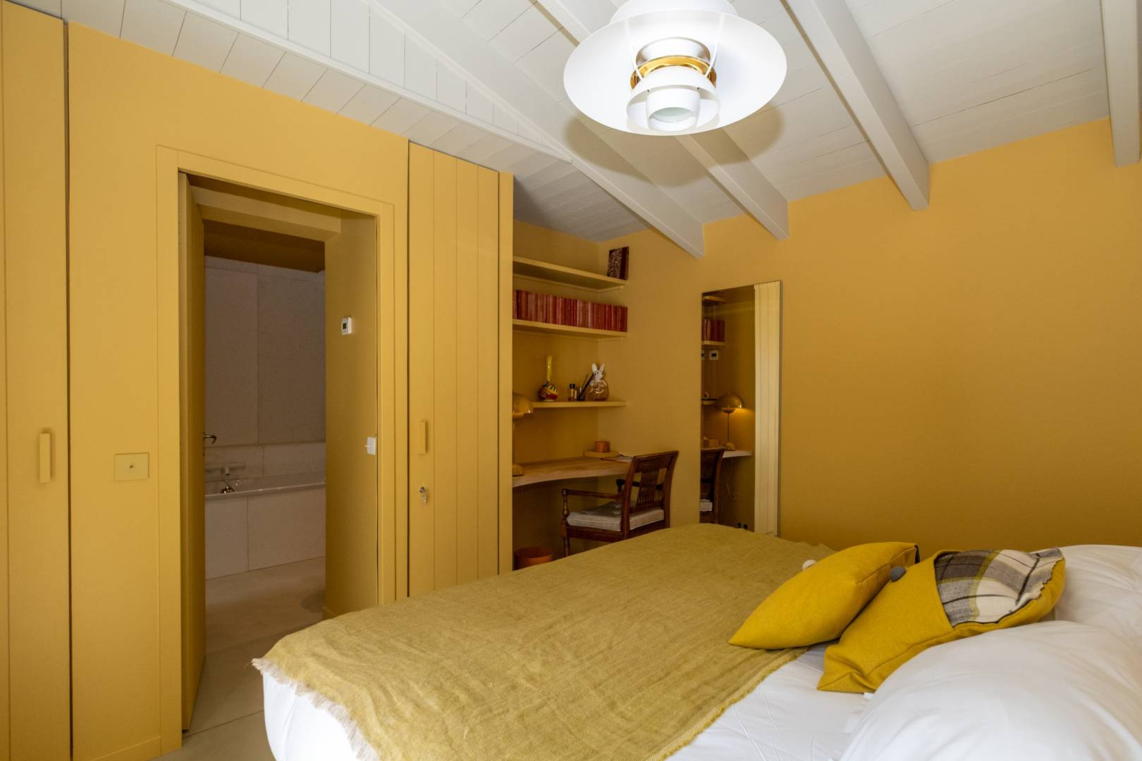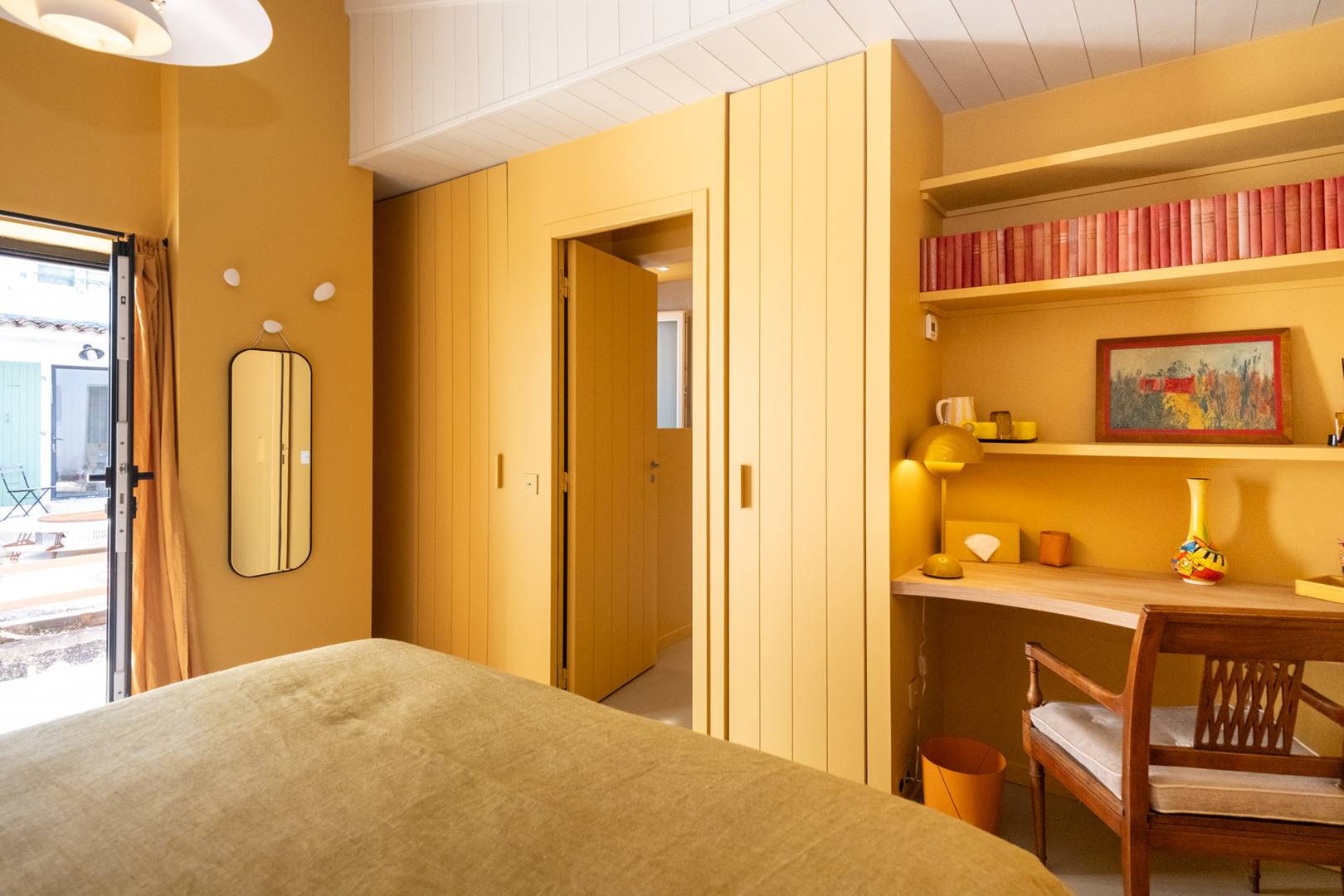 Bedroom 1 (Ochre): Master suite with a view of the pool and garden, 180cm bed, private bathroom (shower and bathtub), separate WC