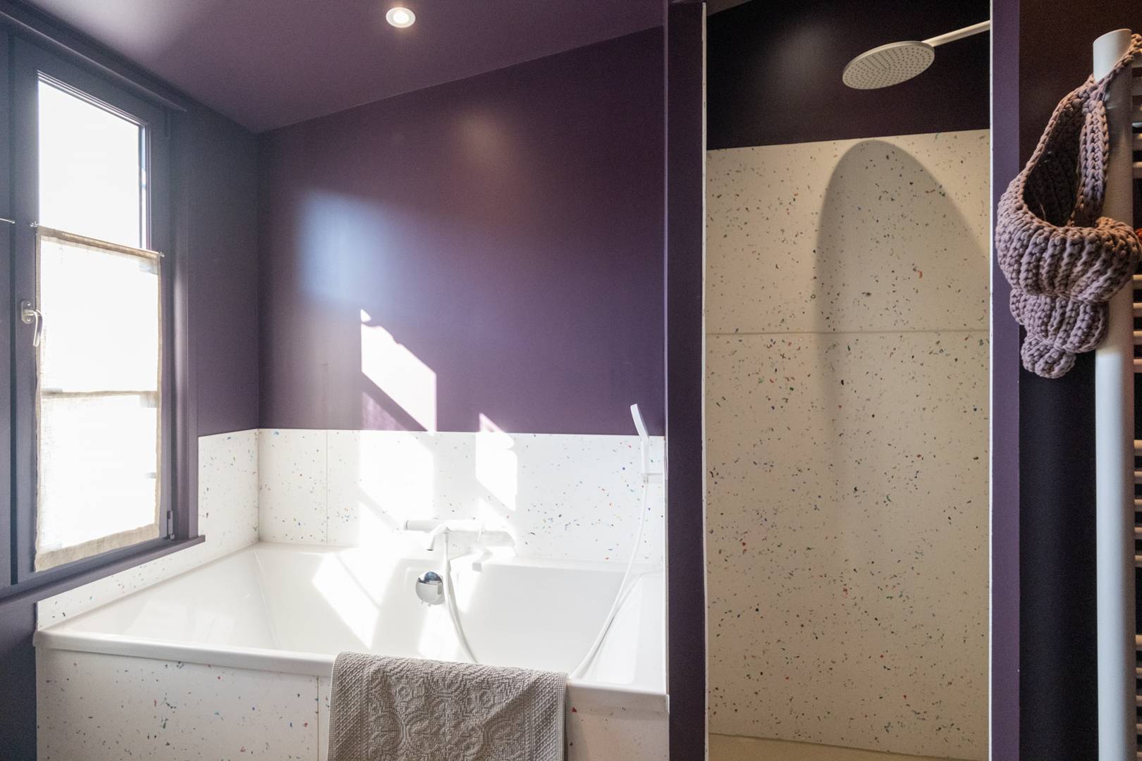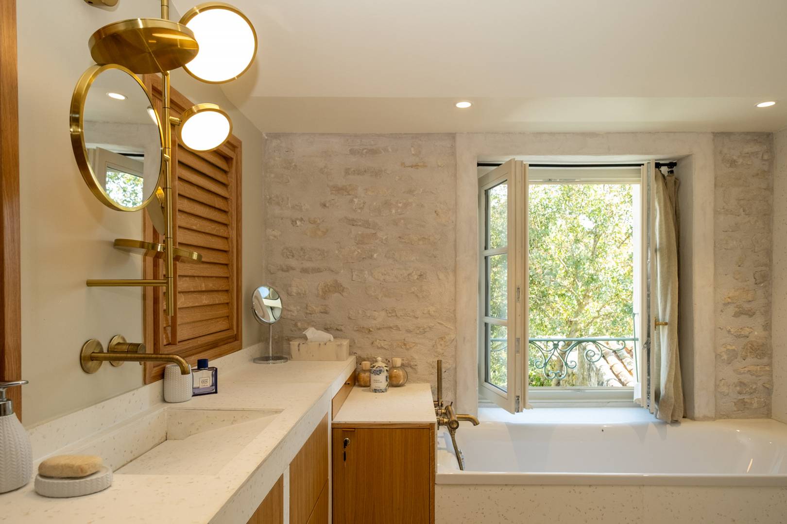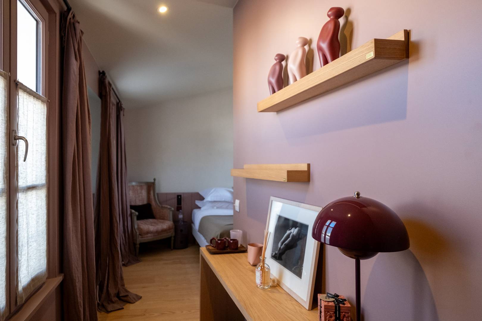Bedroom 1 (Ochre): Master suite with a view of the pool and garden, 180cm bed, private bathroom (shower and bathtub), separate WC