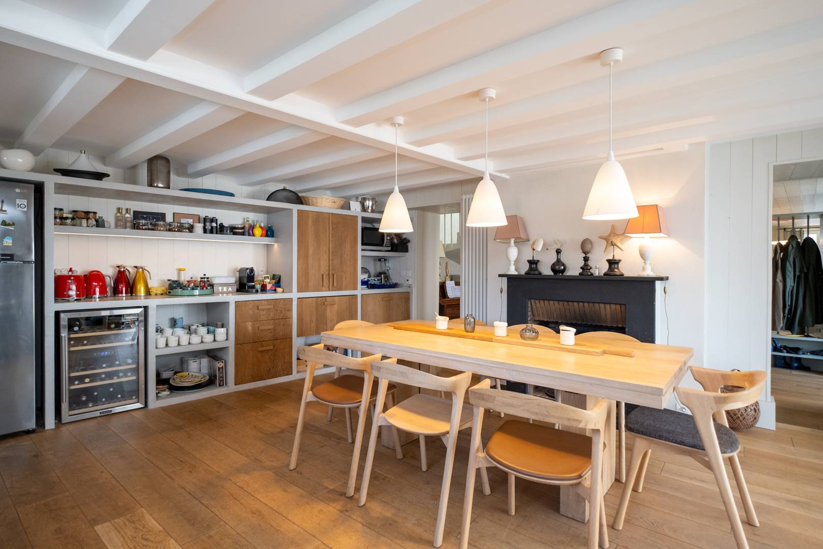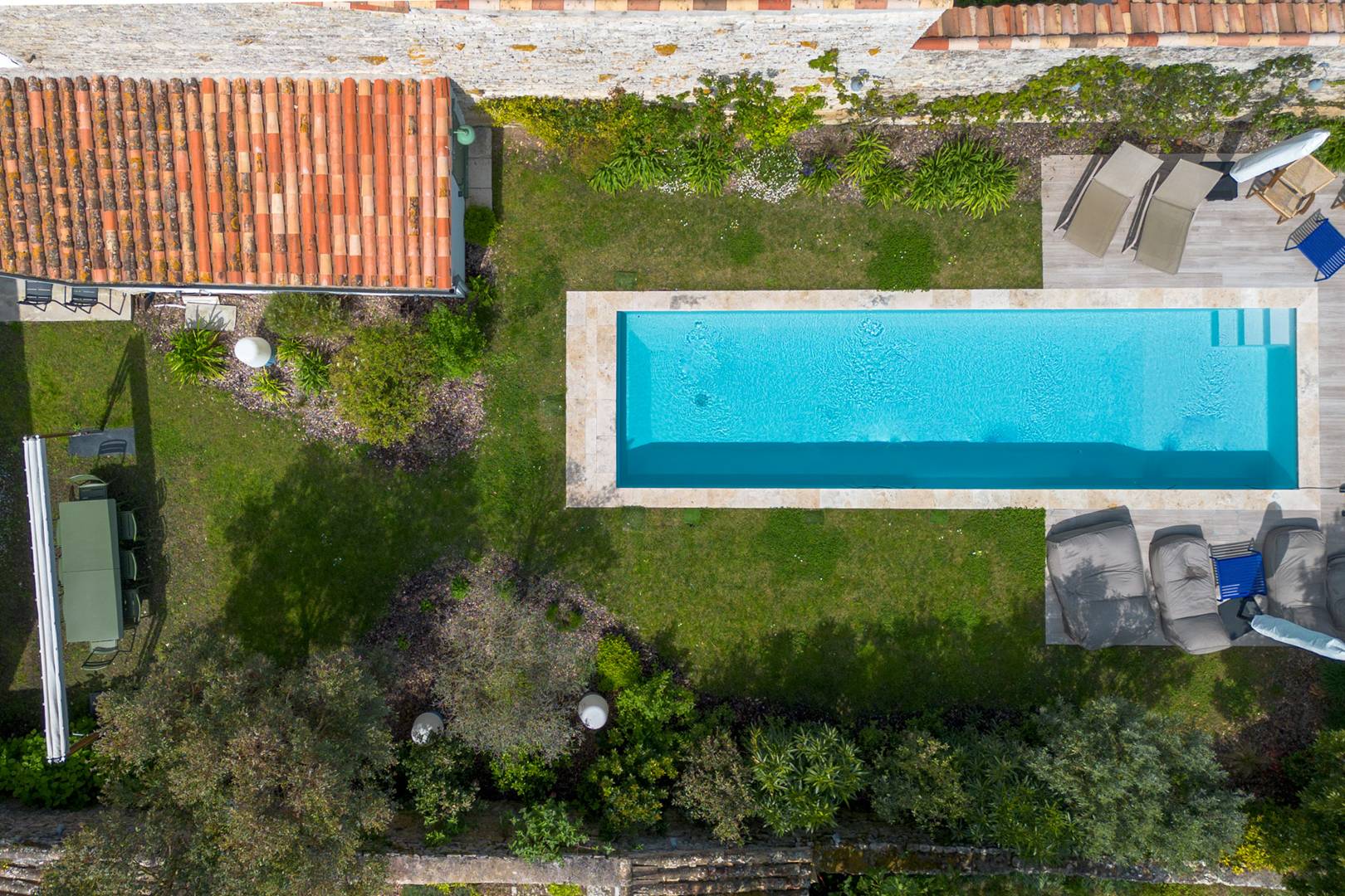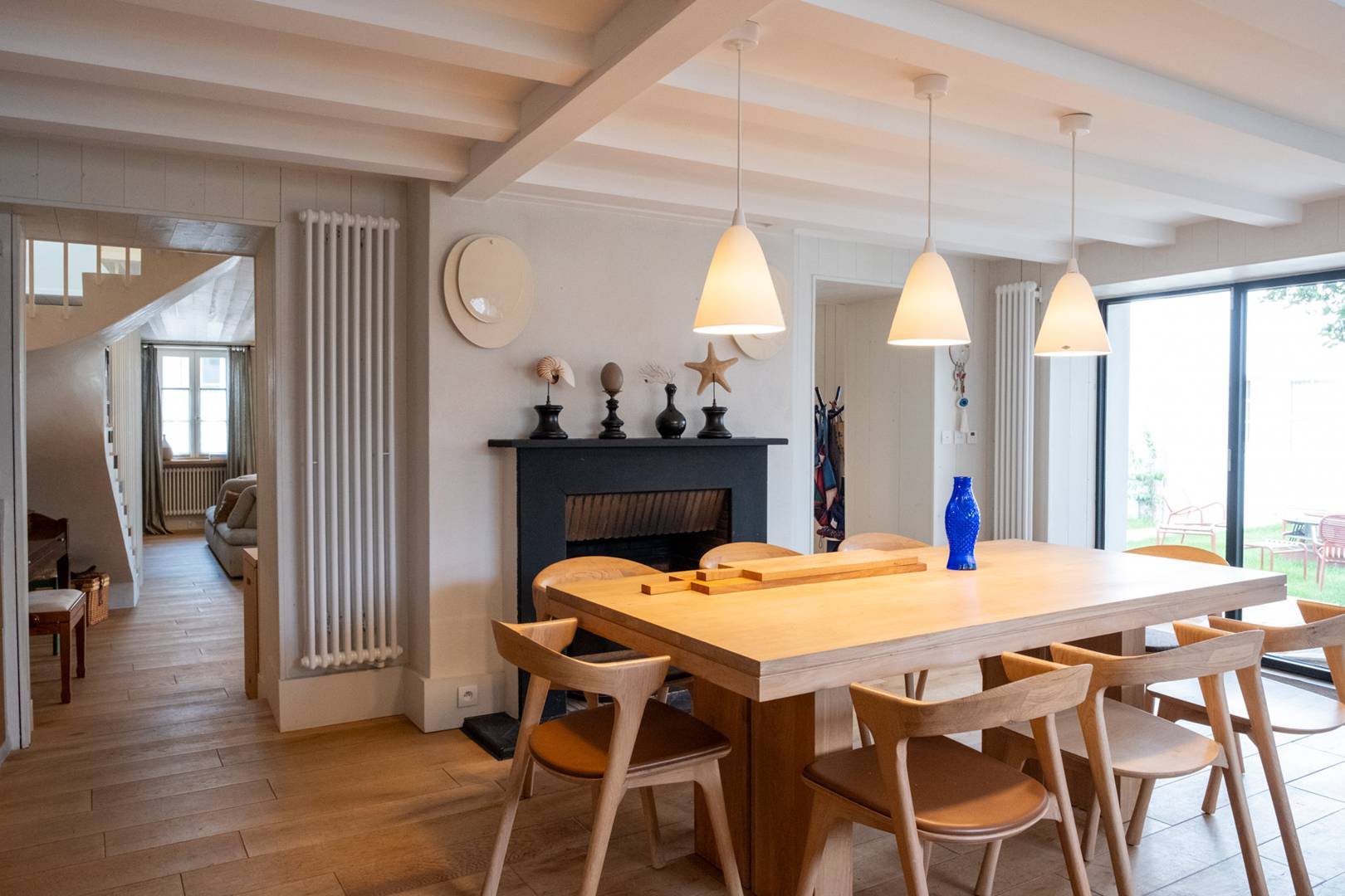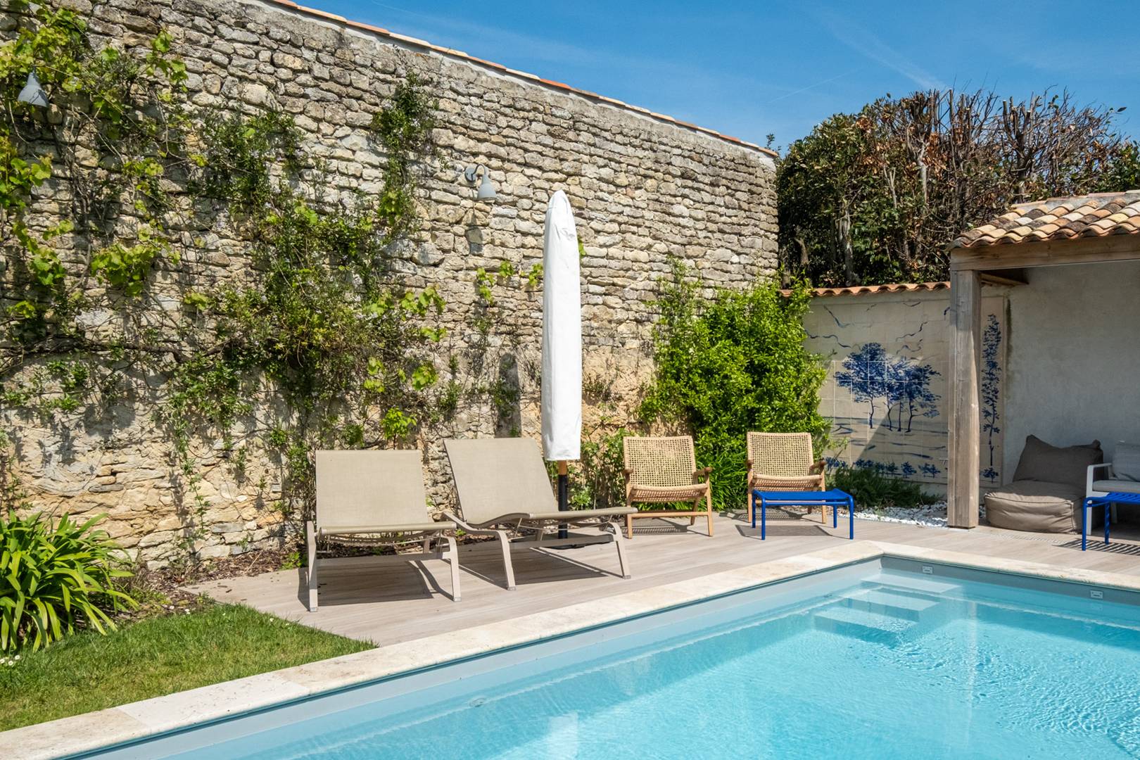 In the heart of the charming village of Ars en Ré, this family home will delight its guests. After falling in love with the potential of this Rhine residence, its owners and their architectural firm undertook a major renovation, imagining their house as a hotel. La Grande Bellezza is made up of two houses "Grande" and "Bellezza" facing each other, sharing a landscaped patio, each with 3 double bedrooms with beds convertible into twin beds and their respective shower rooms and WC, they share a garden landscaped and a heated swimming pool so that large tribes can share friendly moments while enjoying their privacy and comfort. From furniture to bedding to tableware, each object is chosen with great taste and quality to the delight of aesthetes and bon vivants.