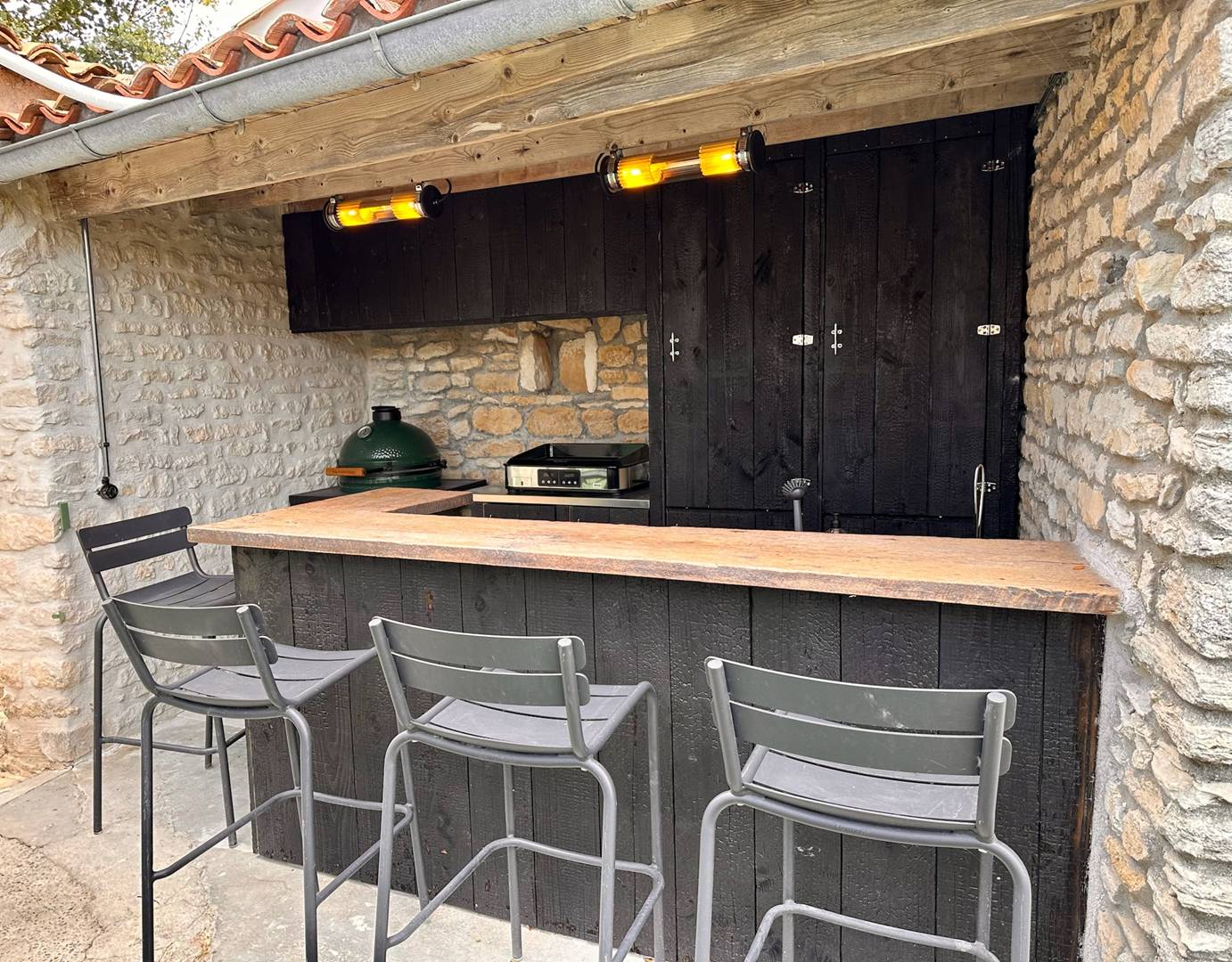 Summer kitchen in the garden, with a refrigerator, The Green Egg barbecue, and an electric Eno griddle
