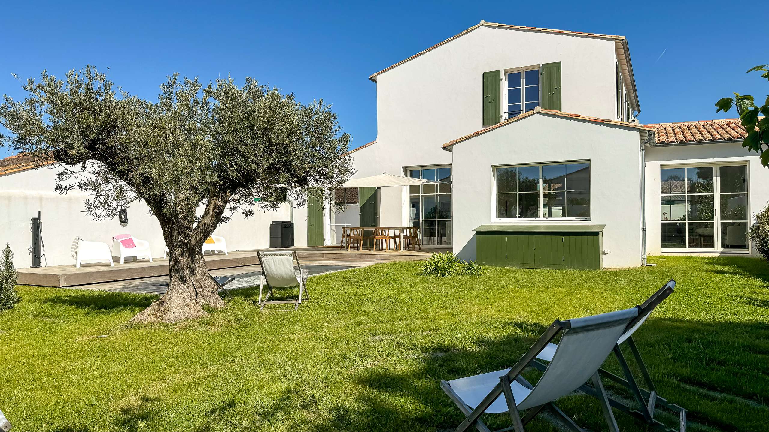 Luxury villa classified 5 stars in furnished tourist accommodation, with swimming pool in the center of La Couarde with garden and private parking. This superb, completely renovated villa offers 5 bedrooms and 4 bathrooms. The large landscaped garden with a swimming pool of 1.90 m x 5.20 m, open from 05/15 to 09/30, protected by a security cover and an outdoor shower, ideal for your vacation. COMPULSORY END OF STAY CLEANING AND LINEN (Bed linen, towels, bath mats and tea towels)