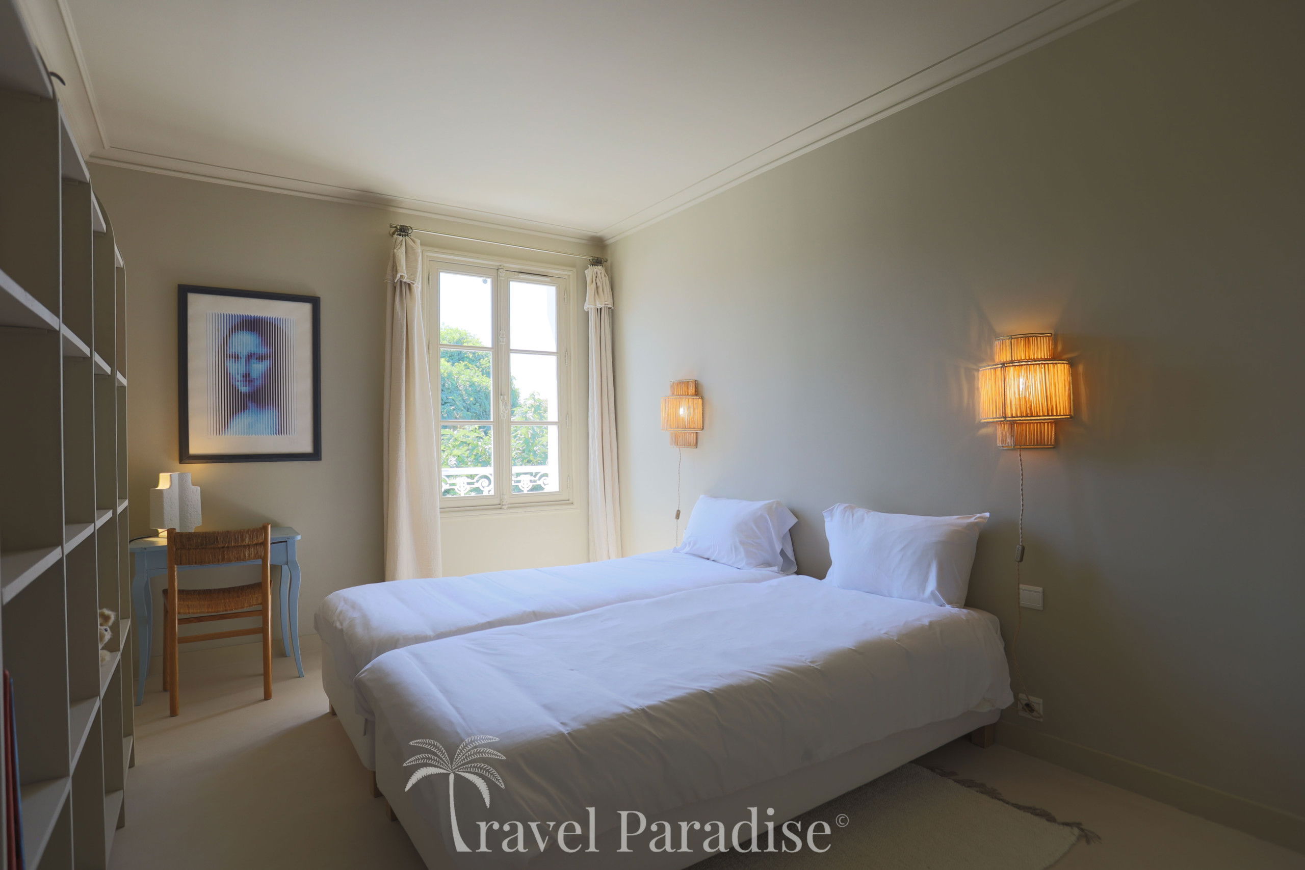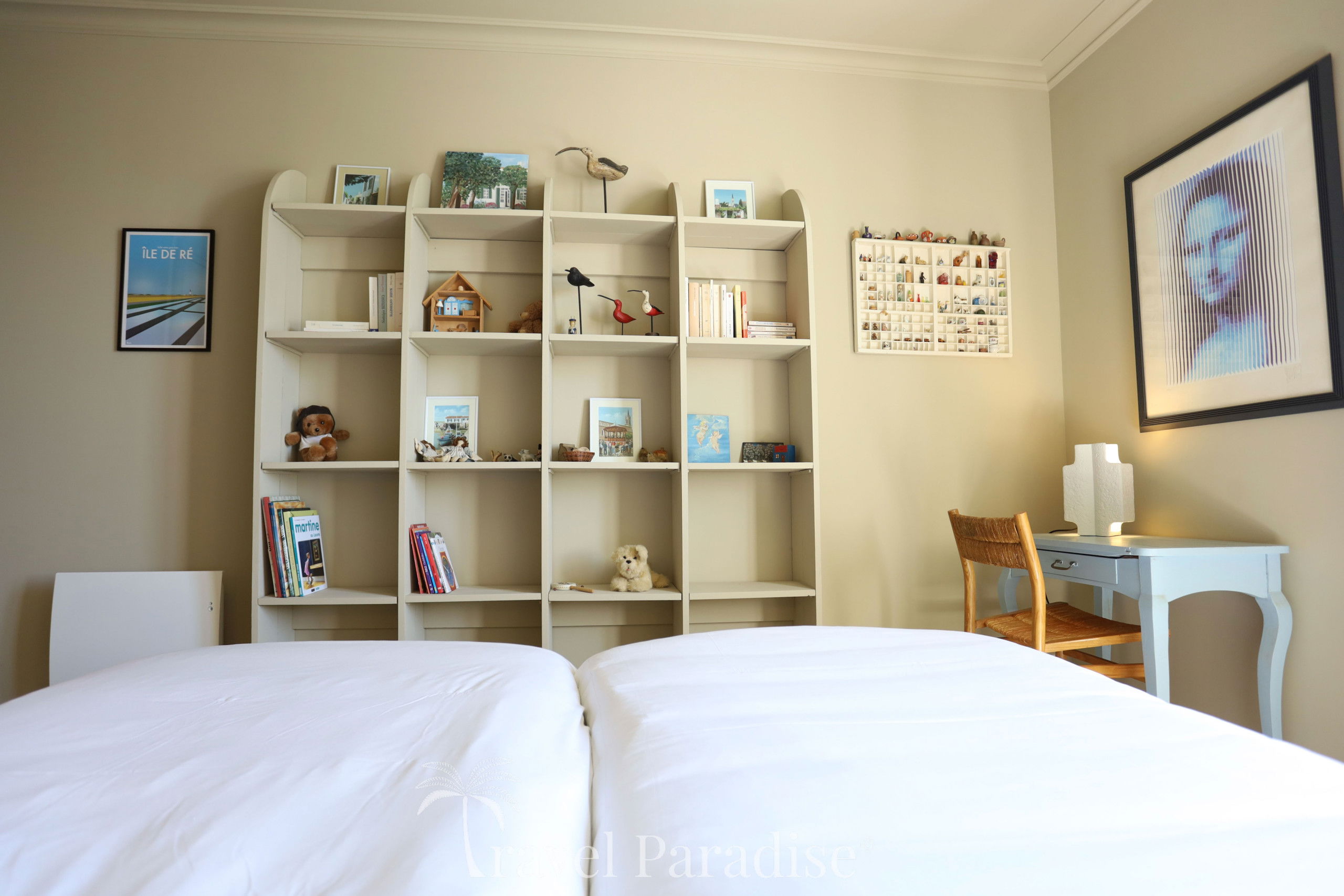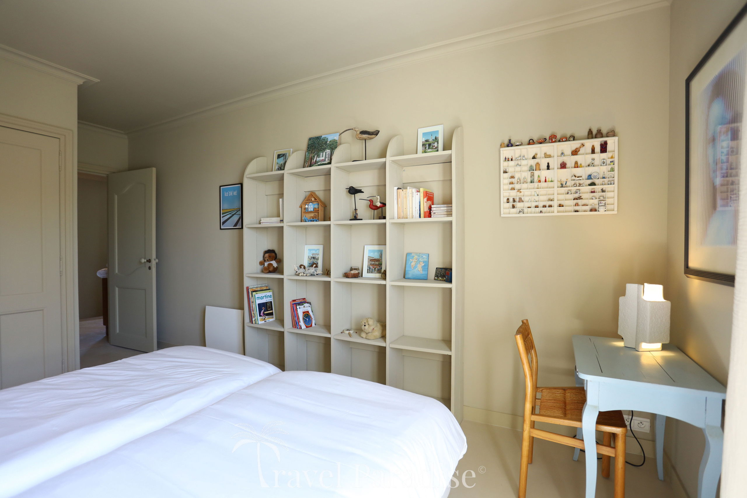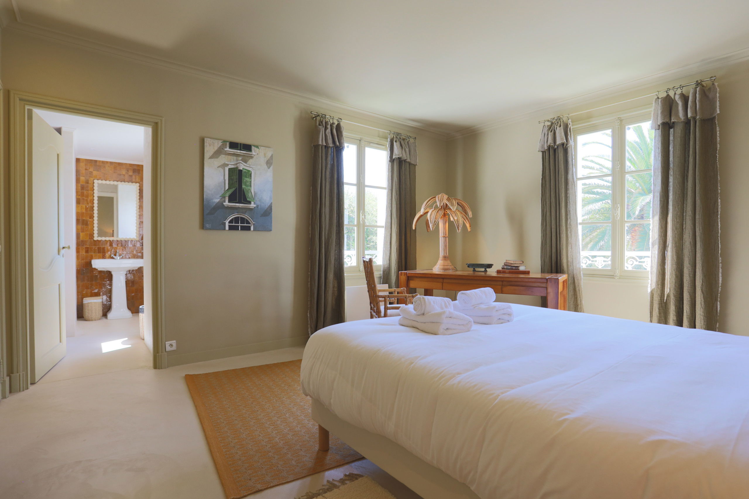 The night space is located on the upper floor and consists of two suites and three rooms sharing two bathrooms/water rooms. Each room is carefully decorated, down to the smallest details, and personalised in soft tones, creating a soothing and elegant atmosphere conducive to rest.