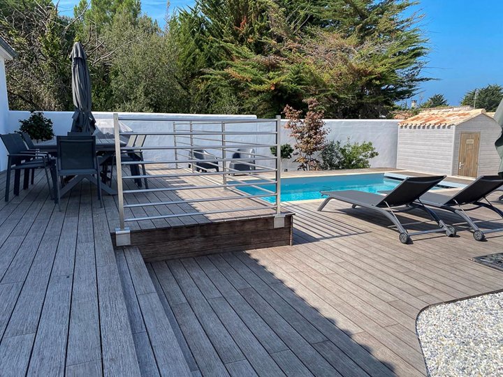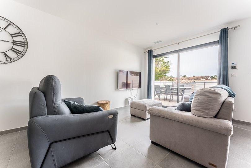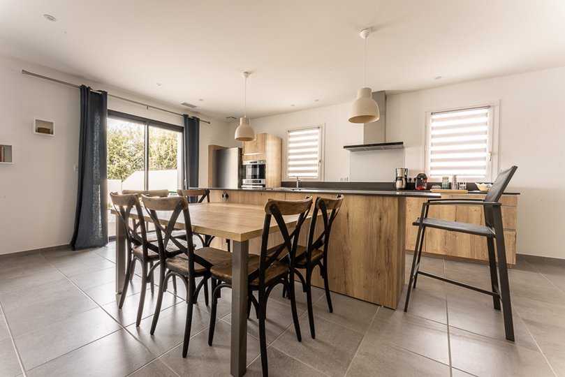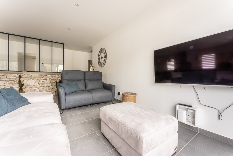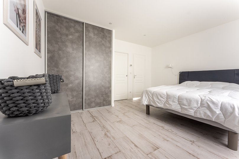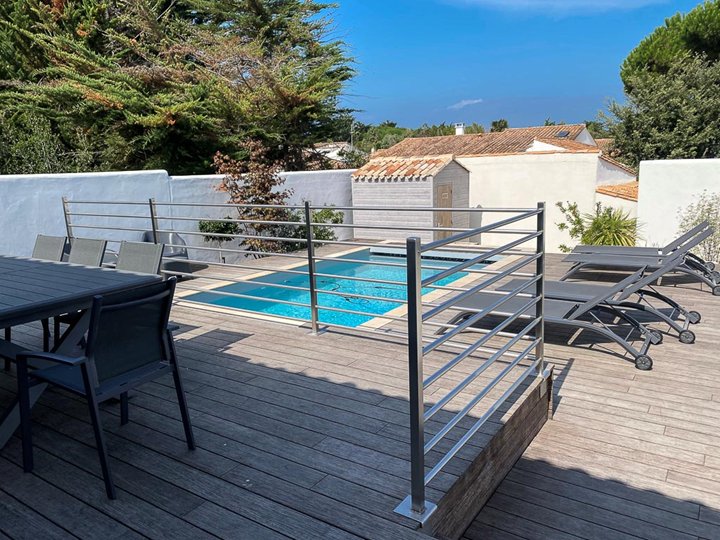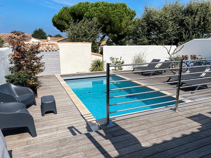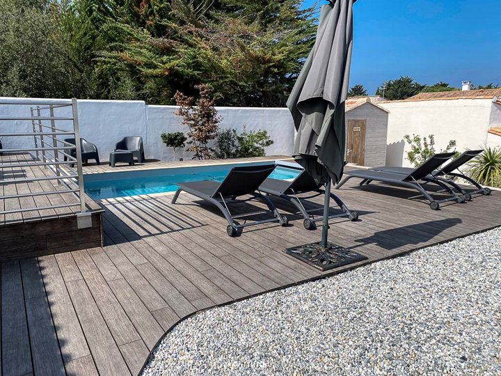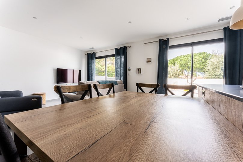 You will appreciate the wooden terrace with an area of ??32m², accessible directly from the living room. It is equipped with a barbecue for your outdoor meals and sunbeds to enjoy the sunny swimming pool.
