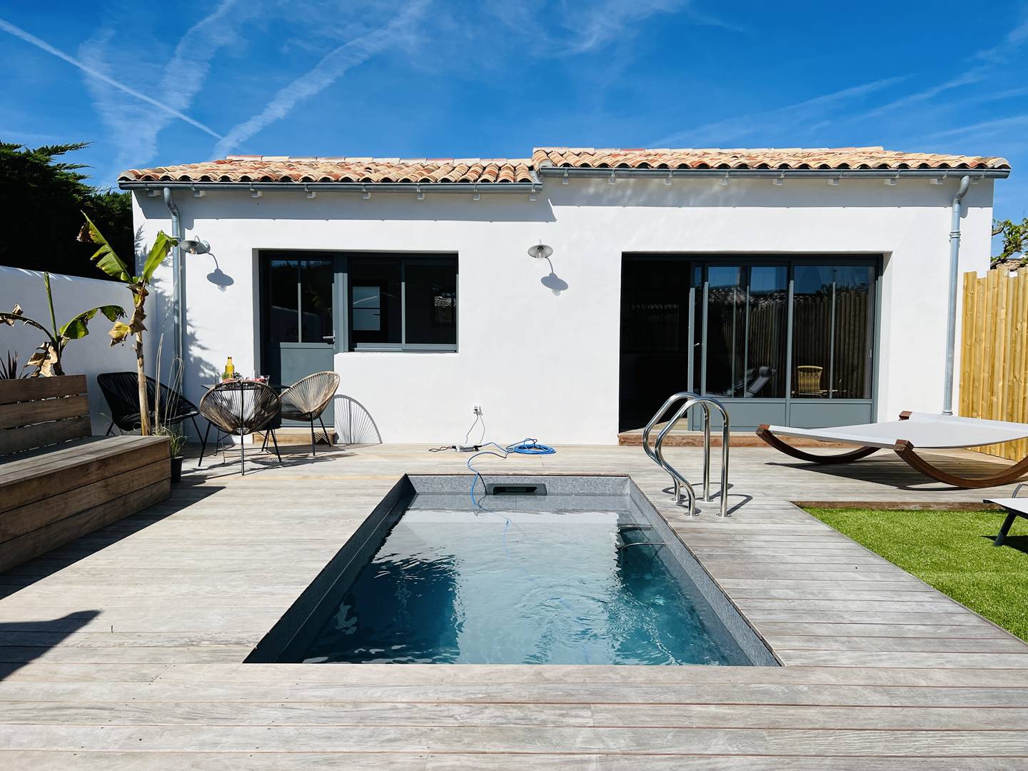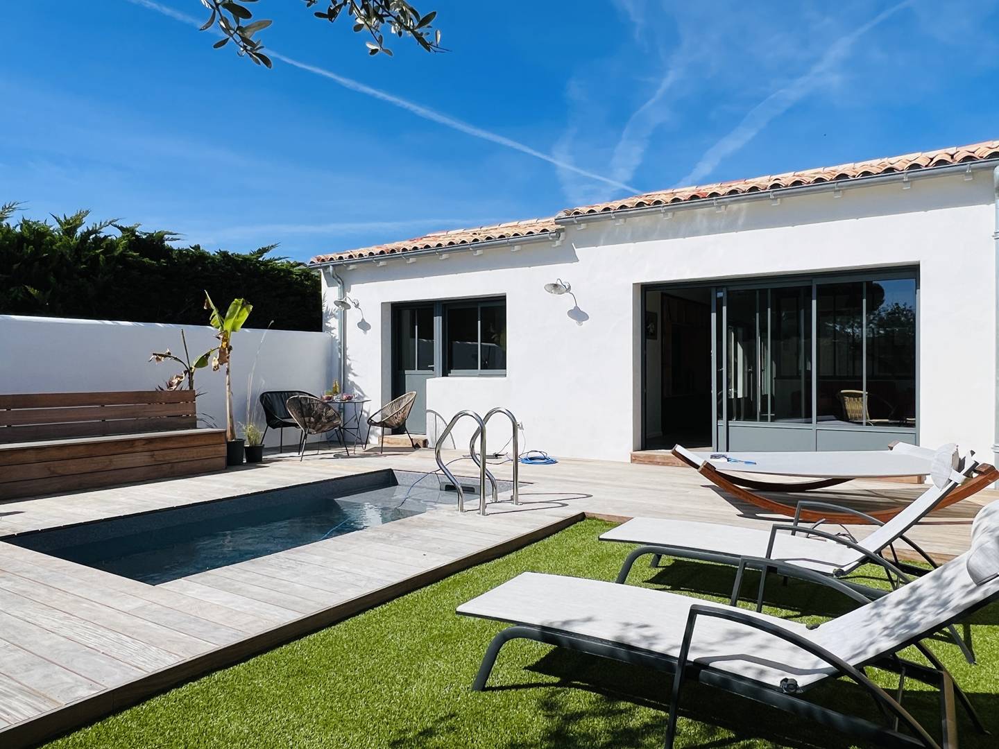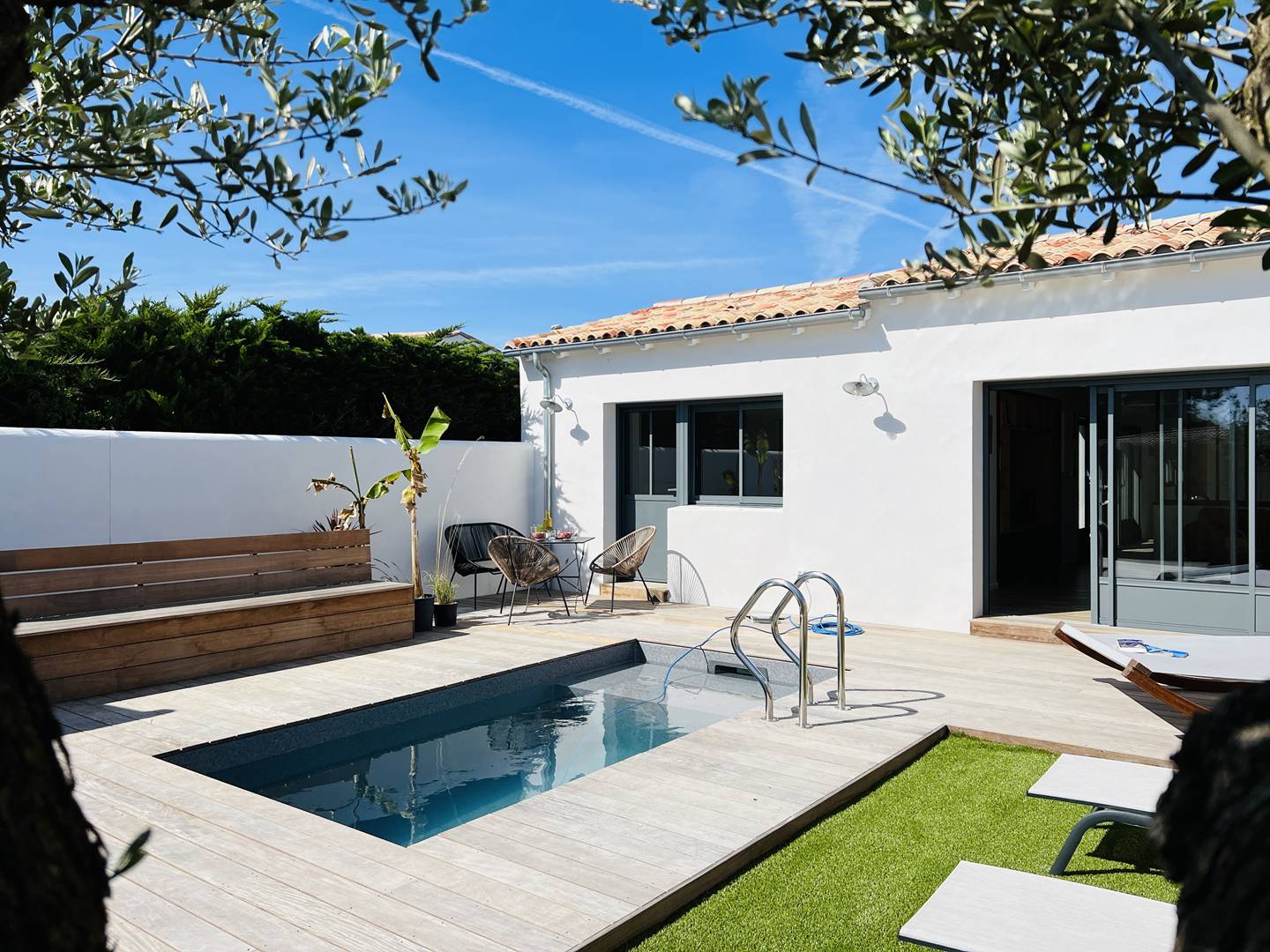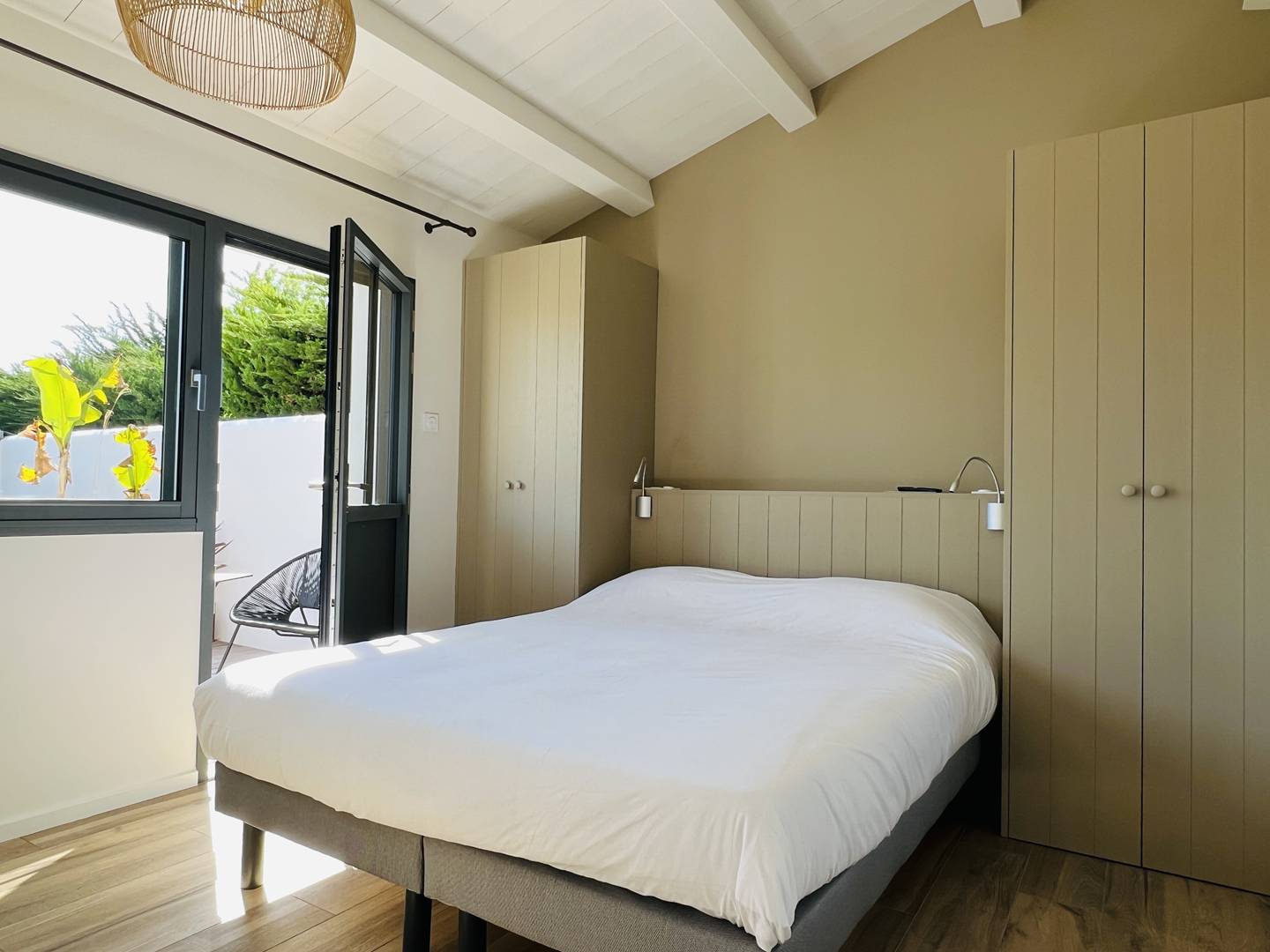 Treat yourself to a relaxing stay for the whole family or with friends in this beautiful house with a nicely decorated swimming pool, carefully equipped for your comfort, in a quiet environment, close to the beach, cycle paths and the center of the charming village of Bois. -Beach ! The entrance serves a large warm and bright living room composed of a fitted kitchen and a beautiful dining table. The kitchen opens onto a outdoor space with garden table, wall-mounted barbecue and a water point. The awning allows you to enjoy a meal in the shade or in the sun at your convenience. You will also enjoy a very bright living room with a view of the swimming pool and the garden. The garden offers a glimpse of sweet moments of idleness comfortably seated by the pool or on the terrace having a coffee. The swimming pool is secured with an electric rolling shutter. It measures 4x2 meters and is heated from April to October (depending on the weather). The sleeping area includes three large bedrooms, each with their own bathroom and cupboards with hanging space and shelves. Two bedrooms are equipped with a 160x200cm double bed, and one bedroom is equipped with two 90x200cm single beds that can be combined into a 180x200cm double bed. You will appreciate the beautiful height under the crawling ceilings and the quality equipment (mattress, bathroom). One of the bedrooms has access to a lovely landscaped patio. A laundry room is at your disposal with washing machine, dryer, ironing board, iron, travel cot and baby high chair. Several parking spaces are available and free in front of the house.