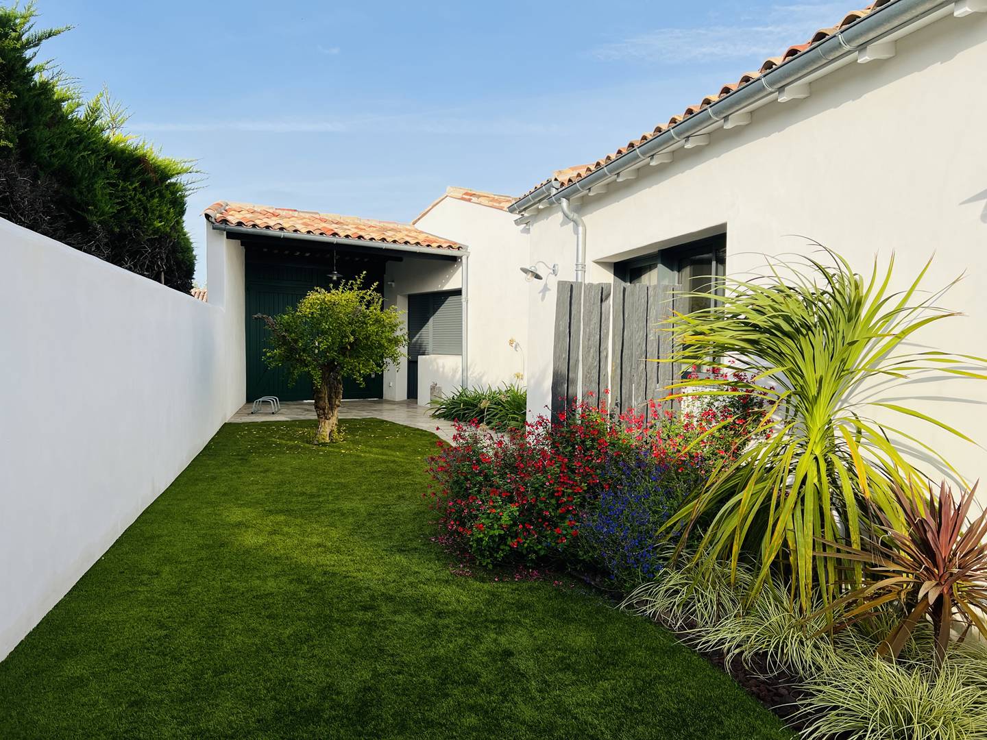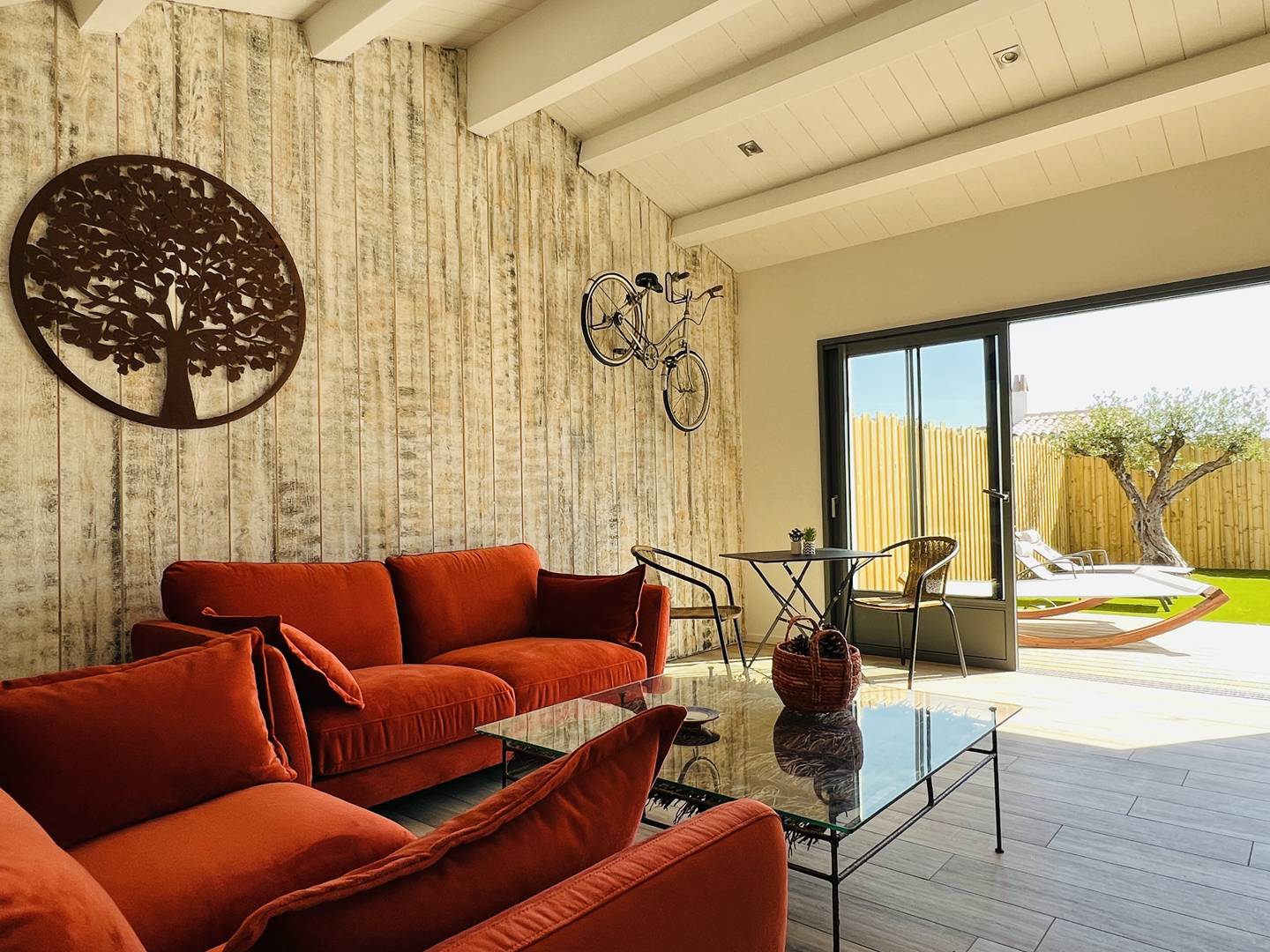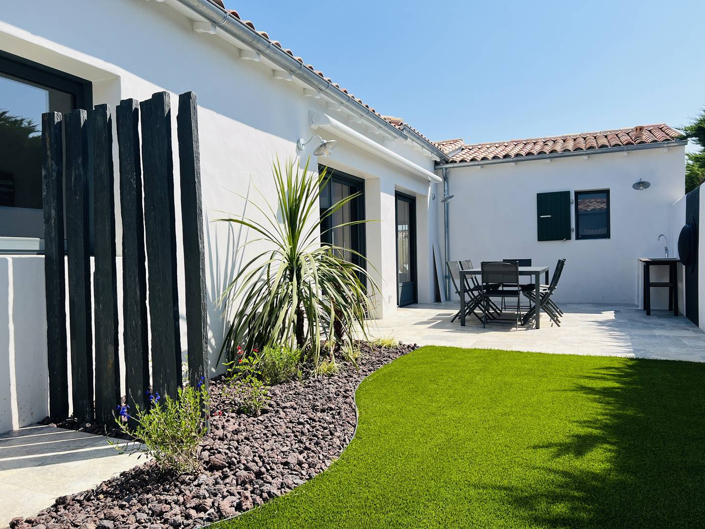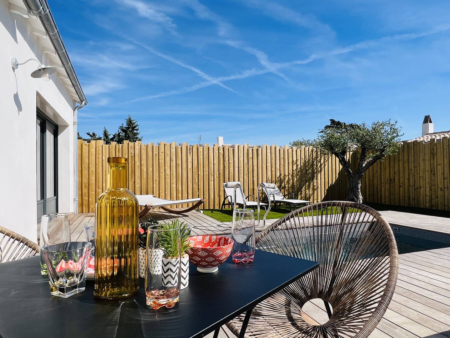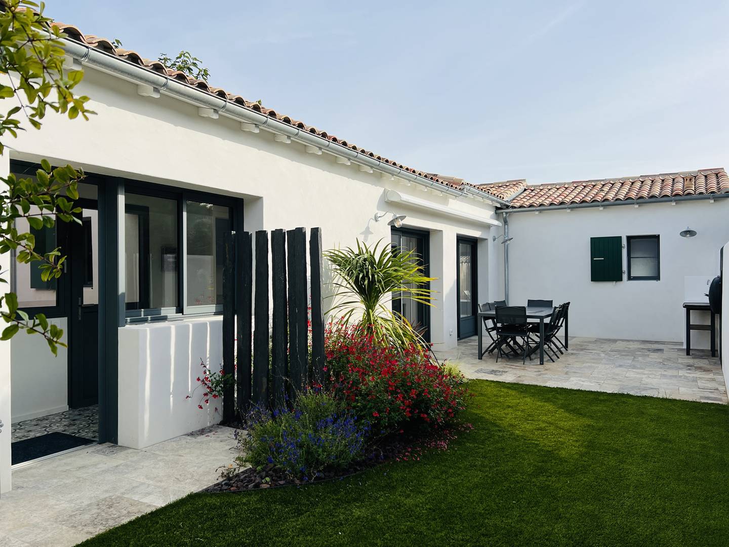 Treat yourself to a relaxing stay for the whole family or with friends in this beautiful house with a nicely decorated swimming pool, carefully equipped for your comfort, in a quiet environment, close to the beach, cycle paths and the center of the charming village of Bois. -Beach ! The entrance serves a large warm and bright living room composed of a fitted kitchen and a beautiful dining table. The kitchen opens onto a outdoor space with garden table, wall-mounted barbecue and a water point. The awning allows you to enjoy a meal in the shade or in the sun at your convenience. You will also enjoy a very bright living room with a view of the swimming pool and the garden. The garden offers a glimpse of sweet moments of idleness comfortably seated by the pool or on the terrace having a coffee. The swimming pool is secured with an electric rolling shutter. It measures 4x2 meters and is heated from April to October (depending on the weather). The sleeping area includes three large bedrooms, each with their own bathroom and cupboards with hanging space and shelves. Two bedrooms are equipped with a 160x200cm double bed, and one bedroom is equipped with two 90x200cm single beds that can be combined into a 180x200cm double bed. You will appreciate the beautiful height under the crawling ceilings and the quality equipment (mattress, bathroom). One of the bedrooms has access to a lovely landscaped patio. A laundry room is at your disposal with washing machine, dryer, ironing board, iron, travel cot and baby high chair. Several parking spaces are available and free in front of the house.