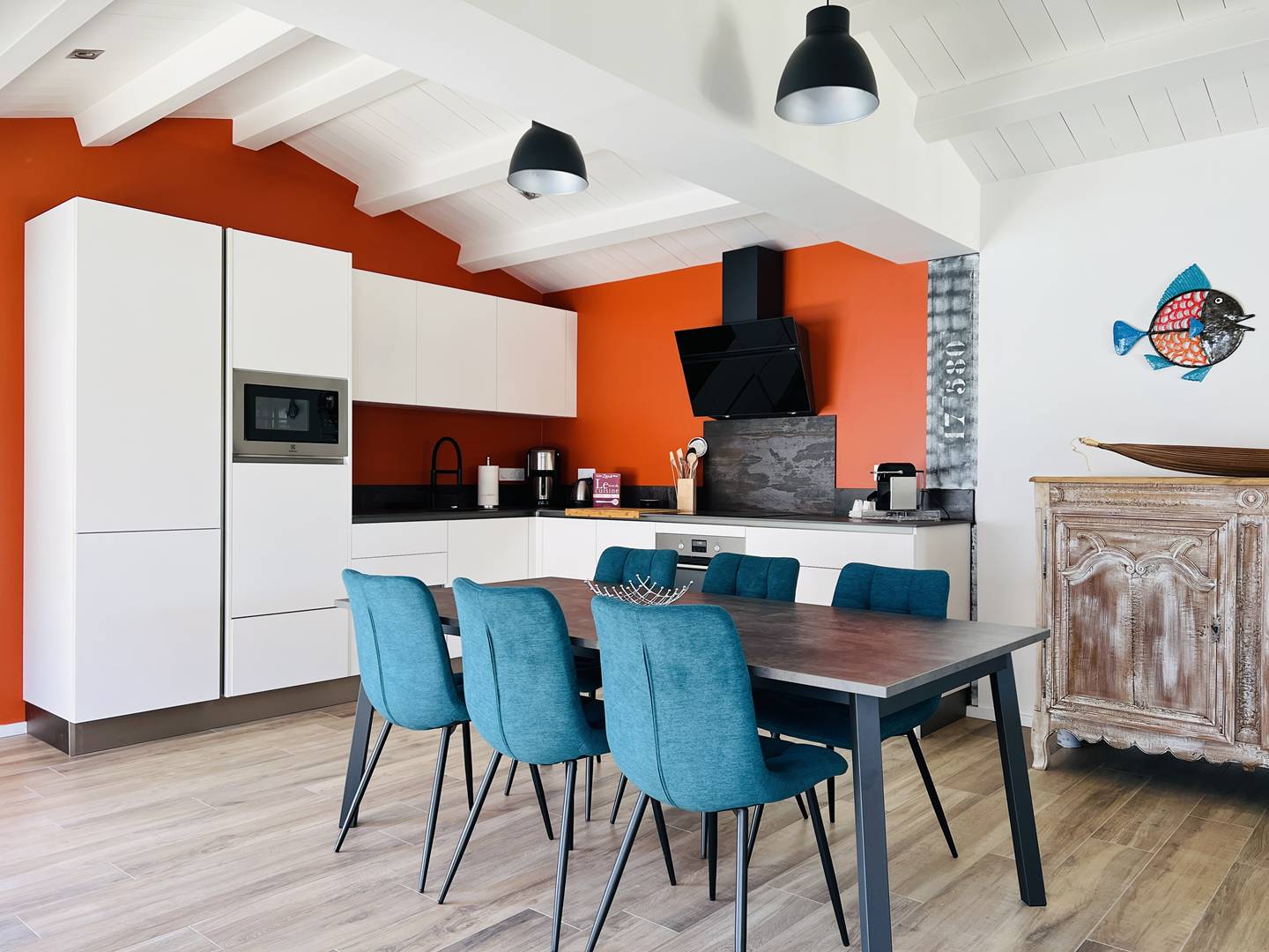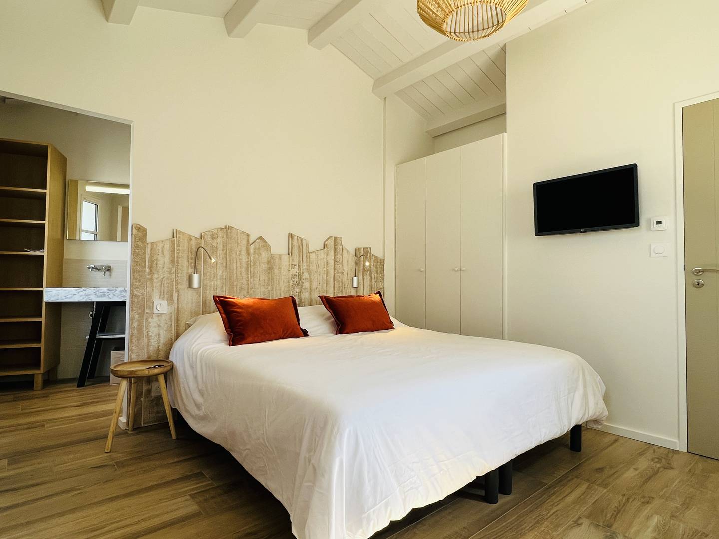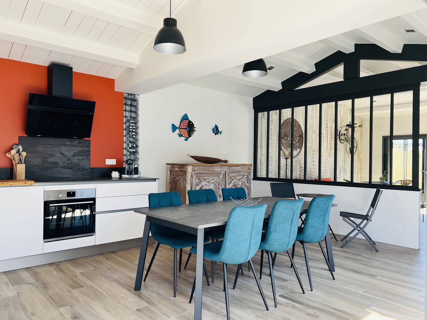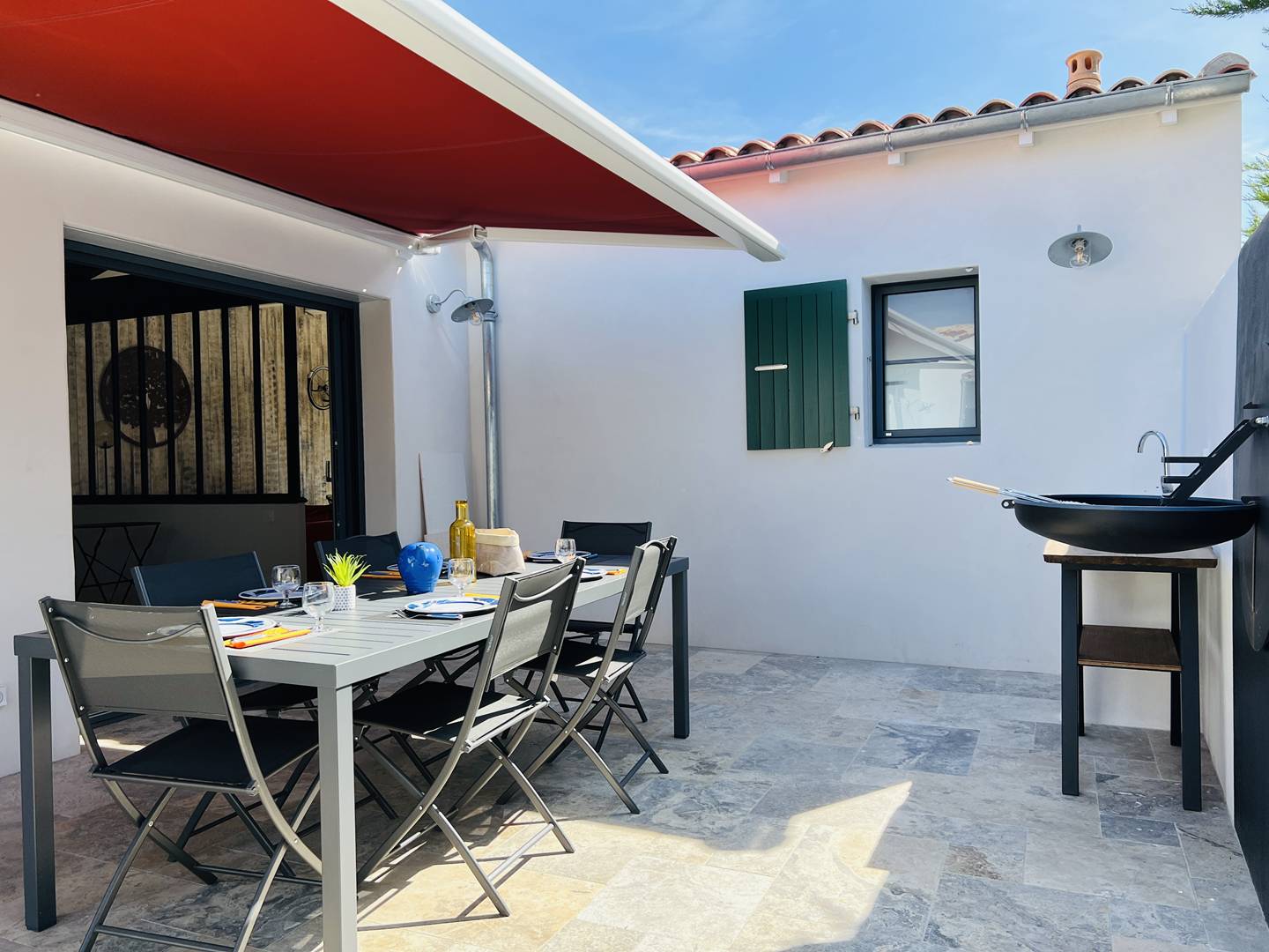 Treat yourself to a relaxing stay for the whole family or with friends in this beautiful house with a nicely decorated swimming pool, carefully equipped for your comfort, in a quiet environment, close to the beach, cycle paths and the center of the charming village of Bois. -Beach ! The entrance serves a large warm and bright living room composed of a fitted kitchen and a beautiful dining table. The kitchen opens onto a outdoor space with garden table, wall-mounted barbecue and a water point. The awning allows you to enjoy a meal in the shade or in the sun at your convenience. You will also enjoy a very bright living room with a view of the swimming pool and the garden. The garden offers a glimpse of sweet moments of idleness comfortably seated by the pool or on the terrace having a coffee. The swimming pool is secured with an electric rolling shutter. It measures 4x2 meters and is heated from April to October (depending on the weather). The sleeping area includes three large bedrooms, each with their own bathroom and cupboards with hanging space and shelves. Two bedrooms are equipped with a 160x200cm double bed, and one bedroom is equipped with two 90x200cm single beds that can be combined into a 180x200cm double bed. You will appreciate the beautiful height under the crawling ceilings and the quality equipment (mattress, bathroom). One of the bedrooms has access to a lovely landscaped patio. A laundry room is at your disposal with washing machine, dryer, ironing board, iron, travel cot and baby high chair. Several parking spaces are available and free in front of the house.