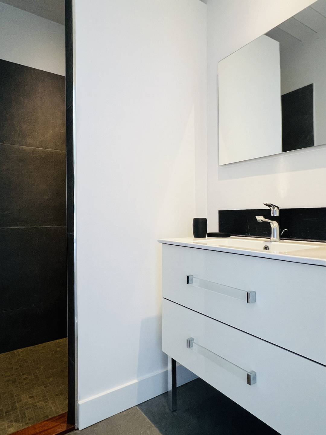 The main living area has 4 spacious bedrooms (one with a 180x200 cm bed, two with 160x200 cm double beds and one with 140x200 cm and 90x200 cm bunk beds). Each bedroom has its own bathroom with walk-in shower. One of the bedrooms has a bathtub for relaxing moments.