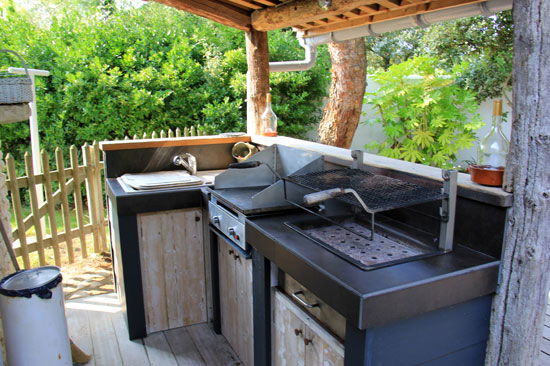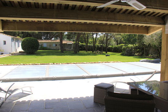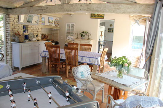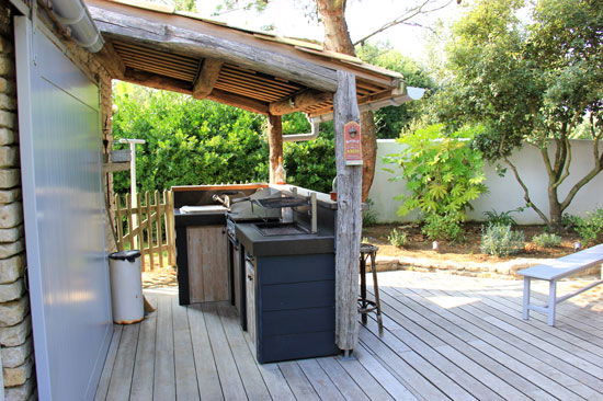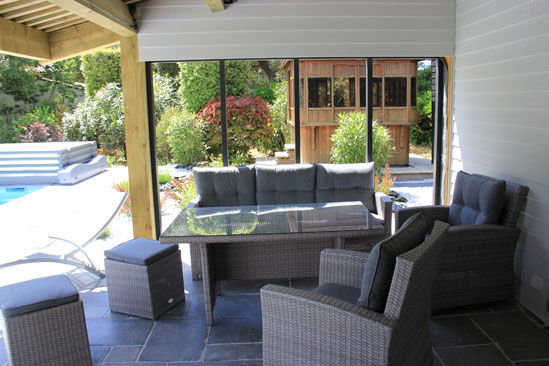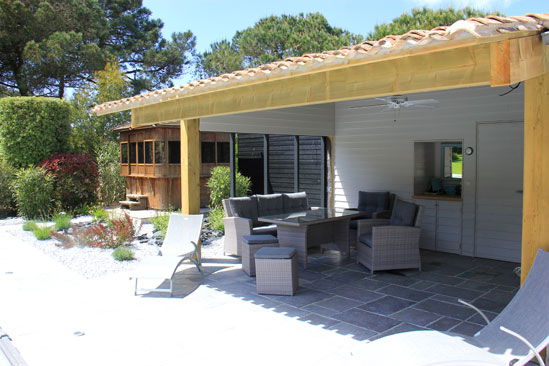 Summer dining room closed with bay windows under the awning overlooking a large terrace on the garden and l\'rear awning, covered bbq – kitchen with refrigerator , dishwasher and sink -