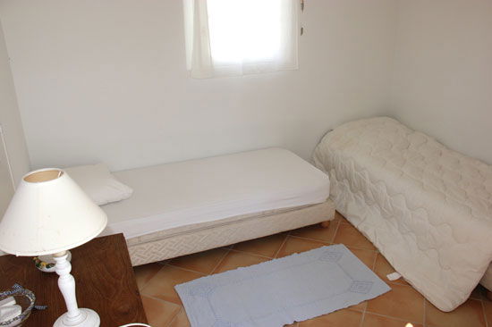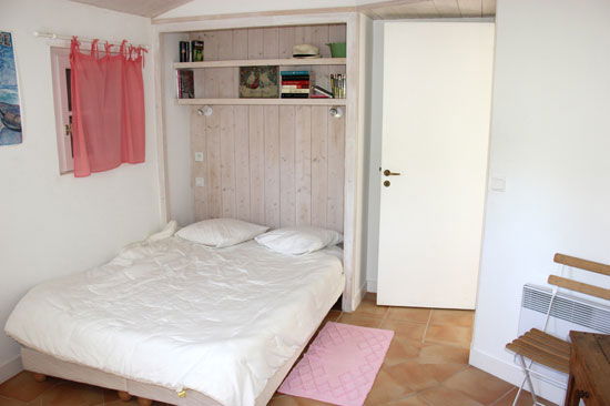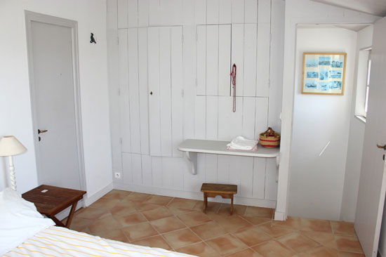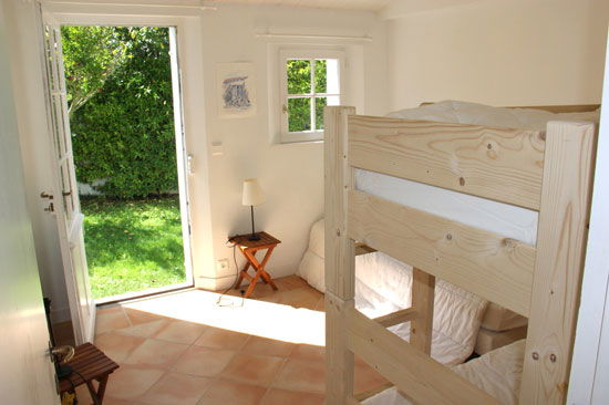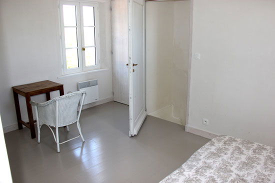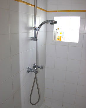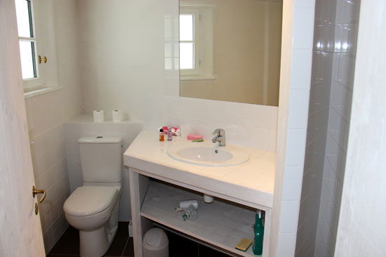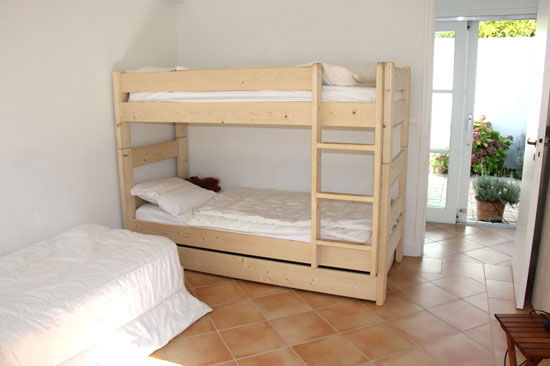 Chambre (au dessus du auvent d\'été) de 18,9 m² avec 2 lits de 80, couettes, placard avec penderie étégères, lit bébé, salle de douche avec douche lavabo et wc -