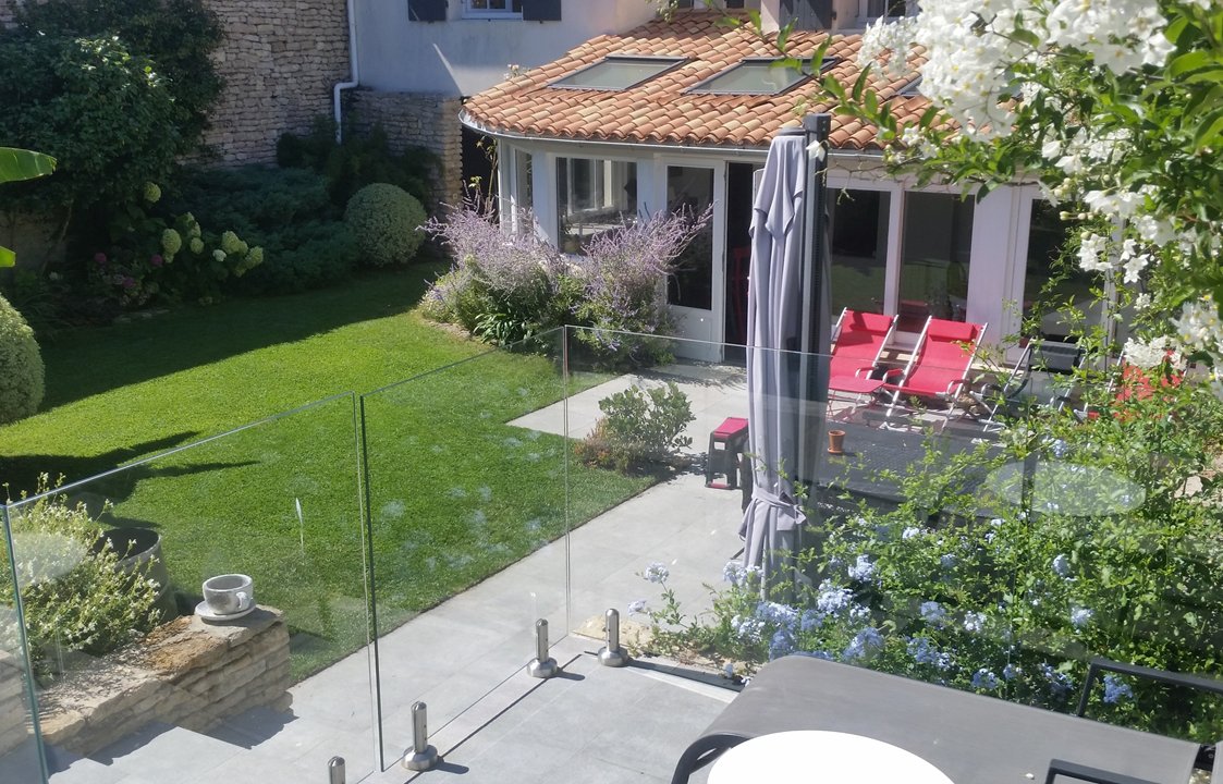 Joli jardin clos de murs donnant sur une très belle terrasse