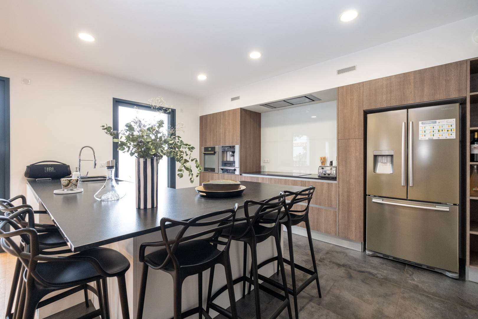 A fully equipped open-plan kitchen with a breakfast bar and 5 bar stools.