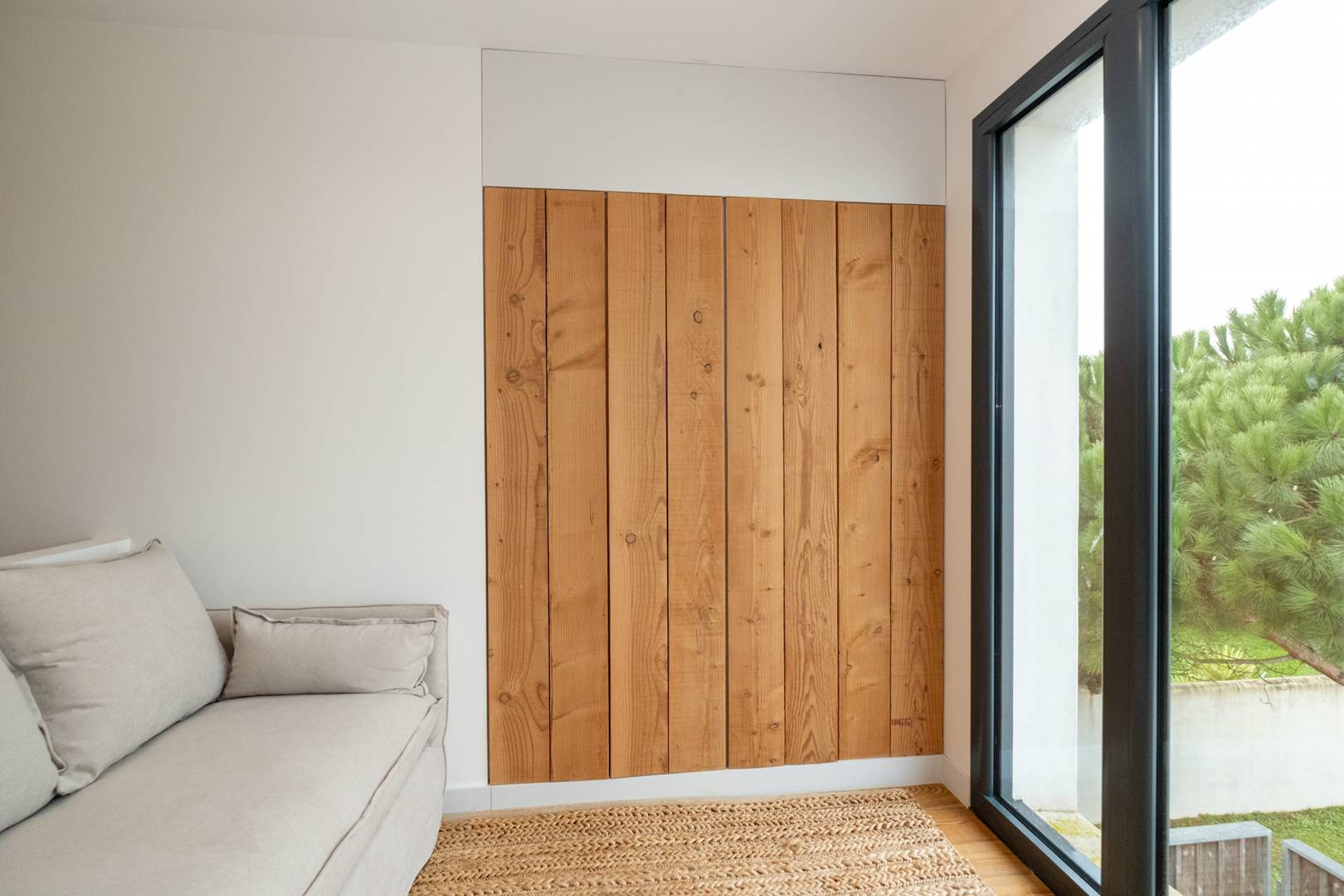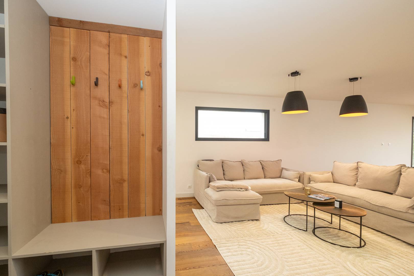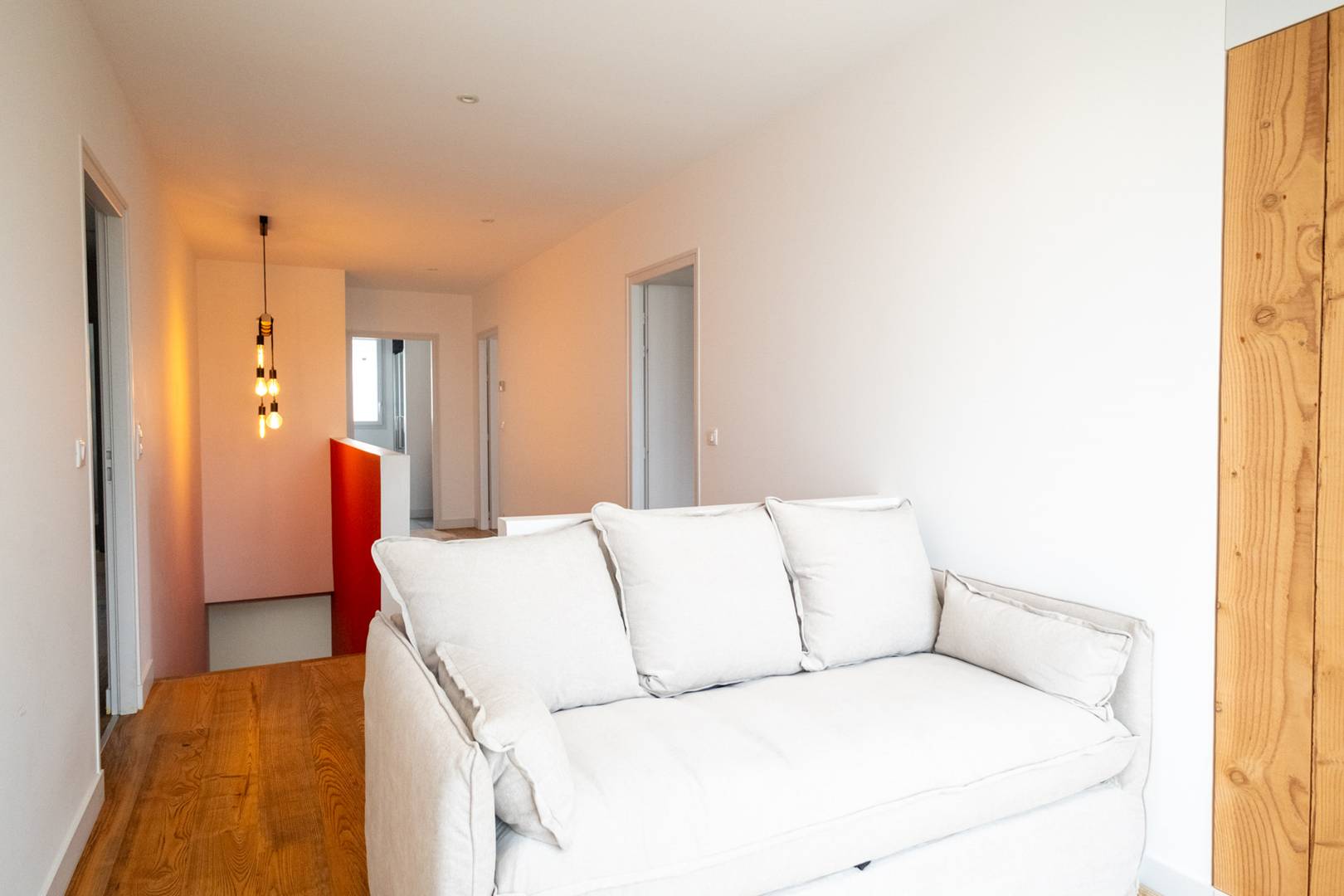 Landing: Relaxation area with a sofa bed, overlooking the garden and the pool.