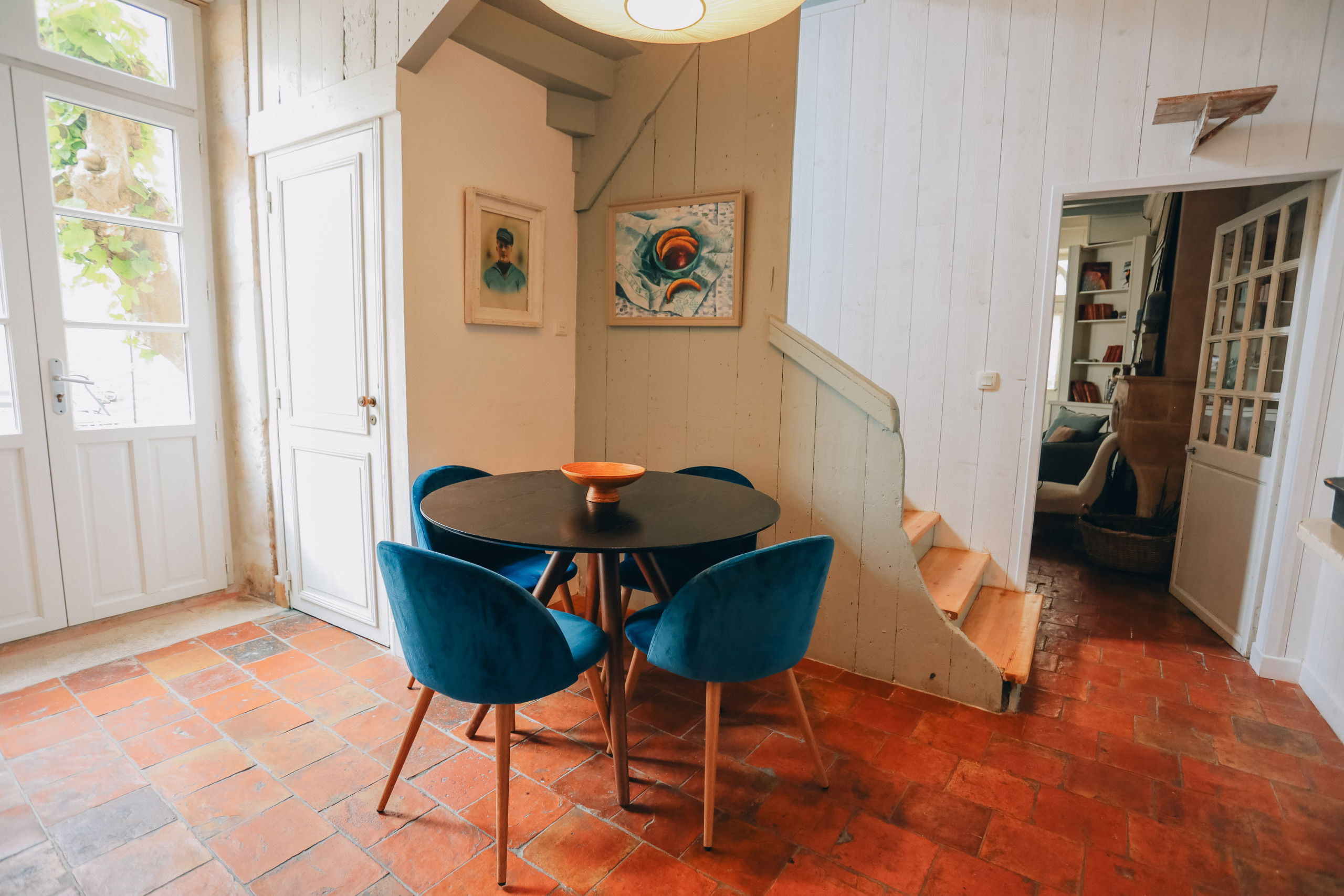 - a cozy dining room with its tiled floor overlooking the outside