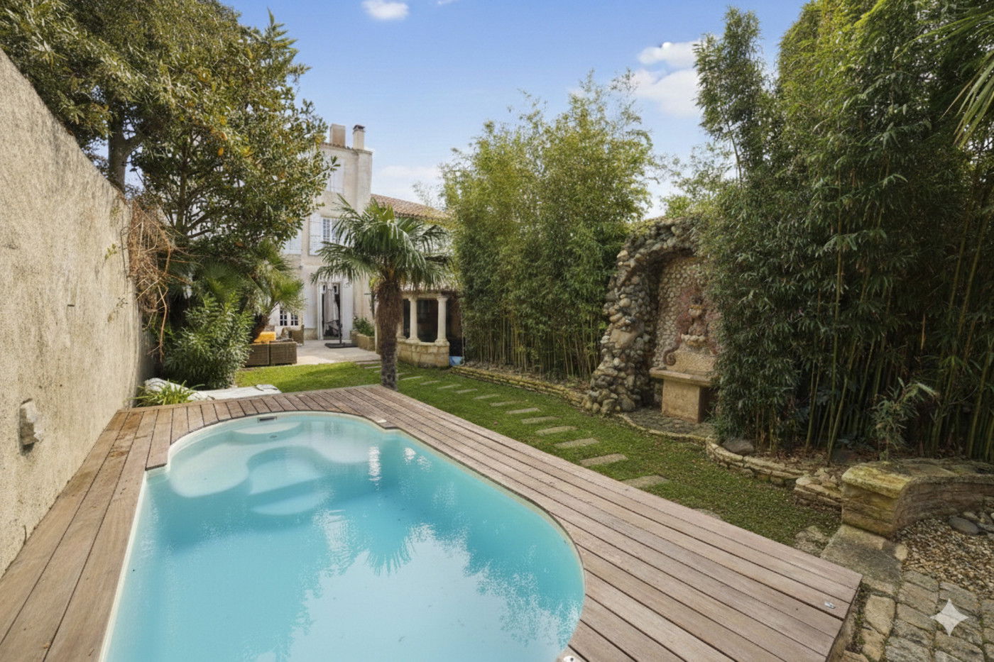 Outside, the Bastide has a large west-facing terrace which will allow you to enjoy sunny moments of relaxation, as well as a beautifully wooded garden which offers, the height of luxury, the only bathing point on the islet: a 3.50m spa.