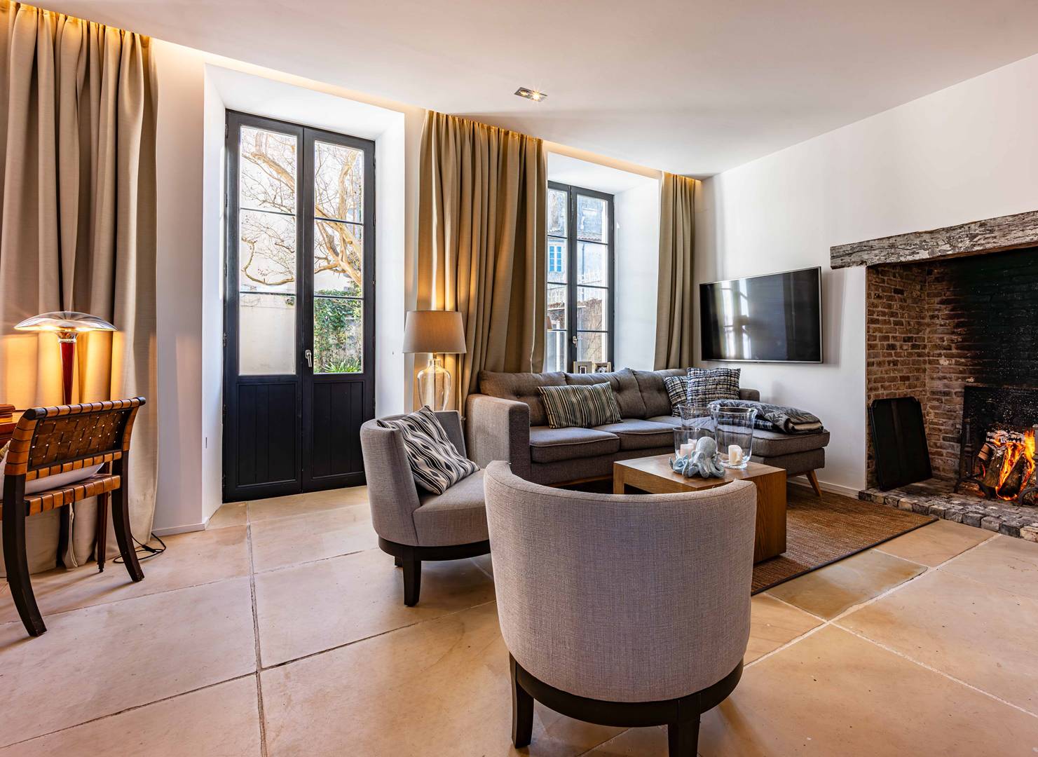 A bright and intimate living room opening onto the outdoors and its fireplace.